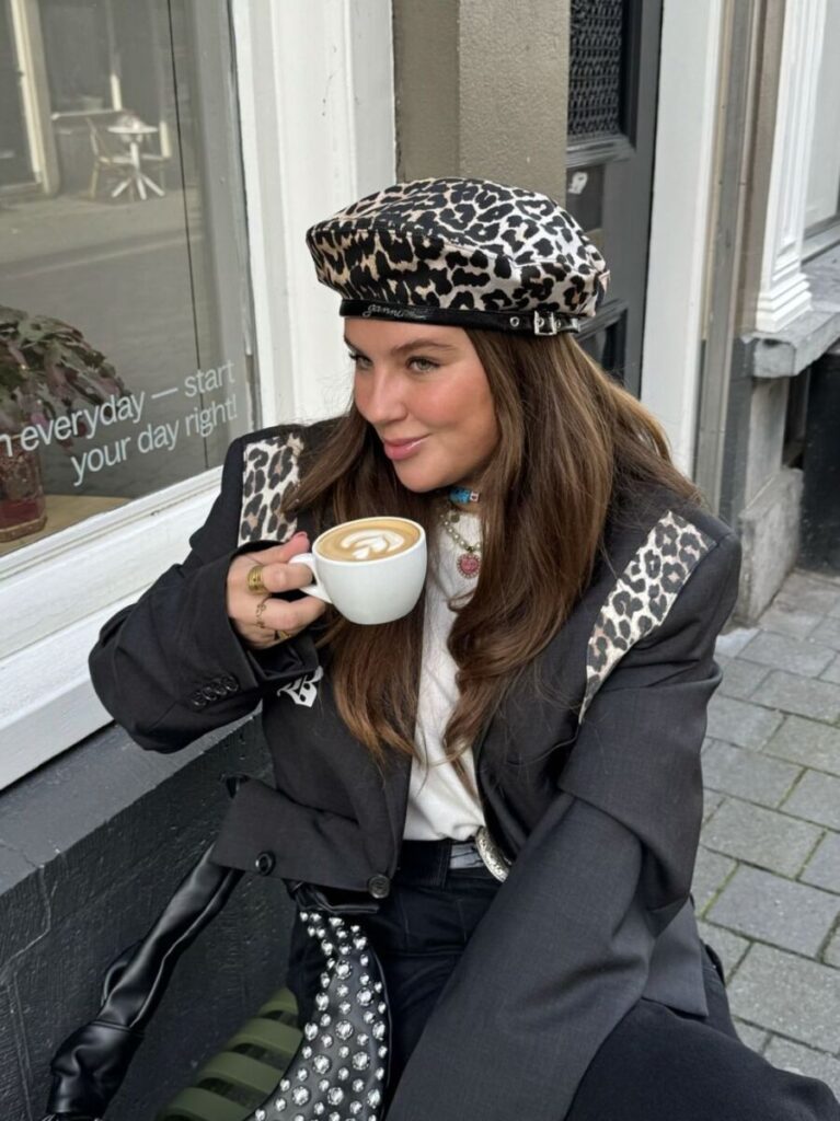 De barret is het hoofddeksel van dit seizoen! We hebben hem nu binnen in een geweldige panterprint. Hij heeft een leren bandje met het logo van Ganni erop.