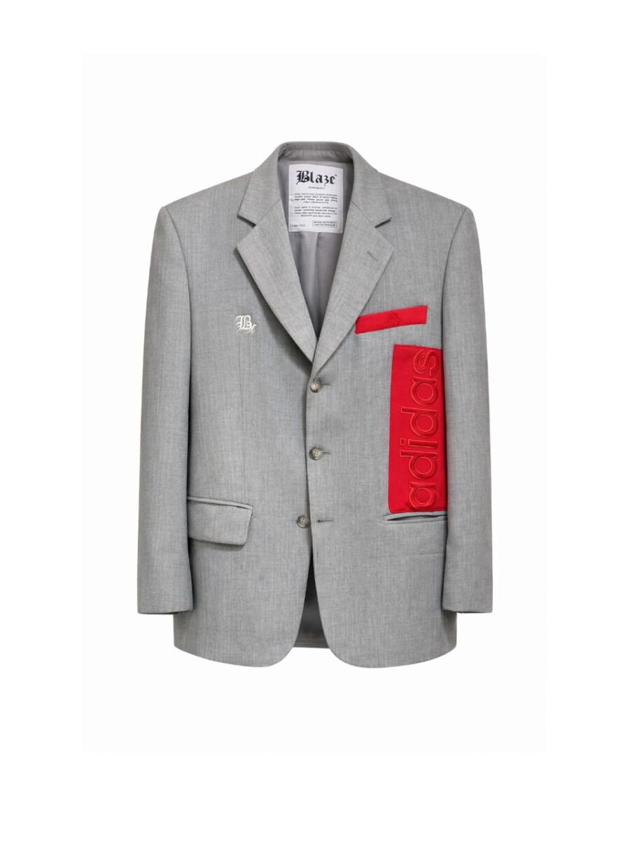 Deze blazer heeft rode Adidas details.