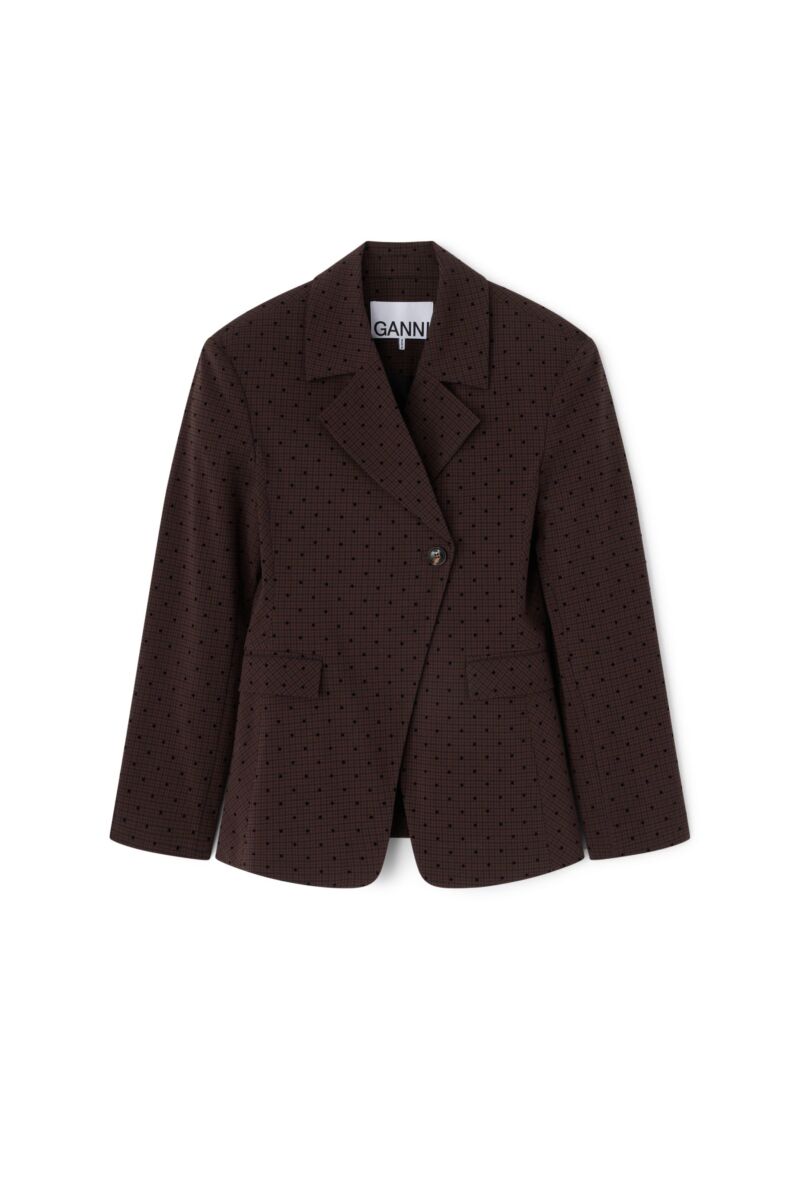 Superleuke blazer van Ganni. De blazer heeft een aangesloten fit en schoudervullingen. Hij heeft een bruine kleur met polka dots! Hij sluit met een schuine sluiting. Combineer met de bijpassende broek om het als set te dragen.