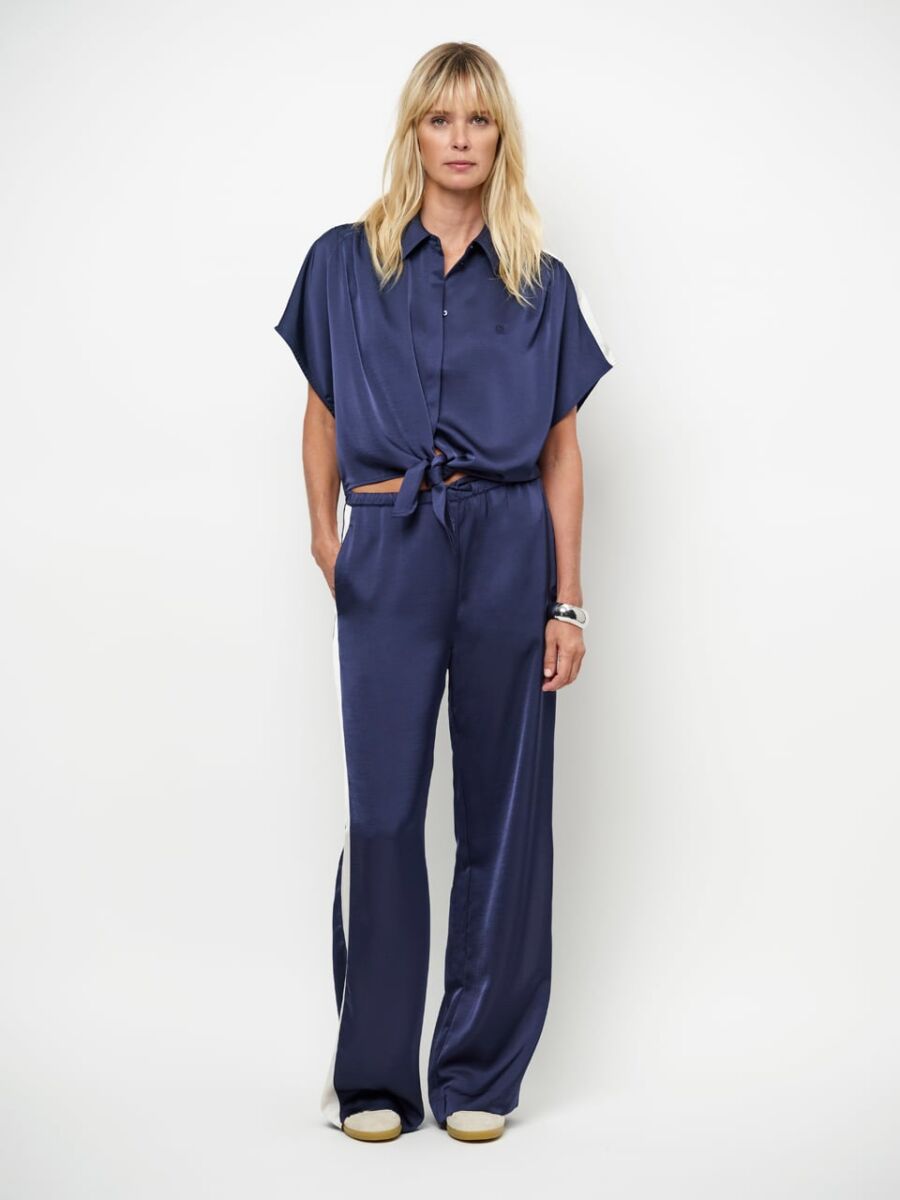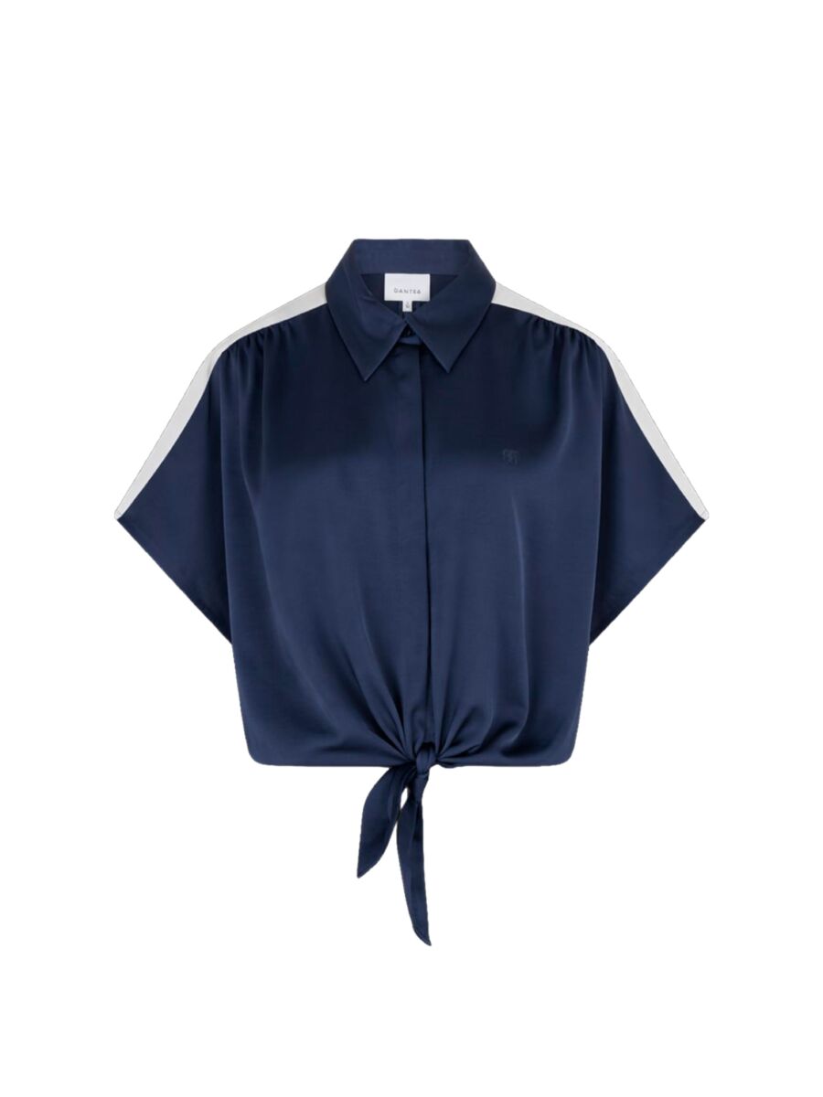 Superleuke blouse van Dante6! Deze donkerblauwe blouse heeft korte mouwen en een kraag. De blouse heeft een knoopdetail en een witte strook over de mouwen. Combineer met de bijpassende broek.l