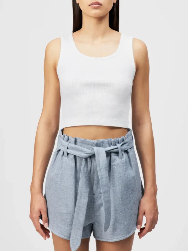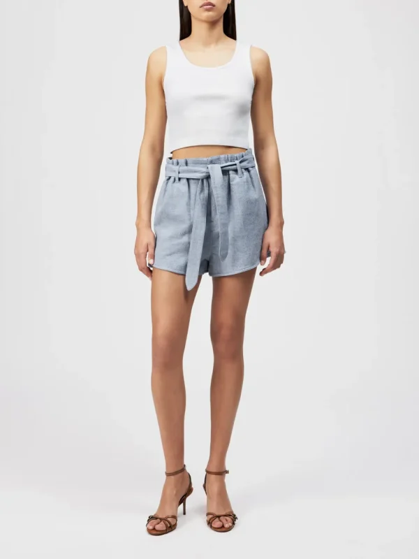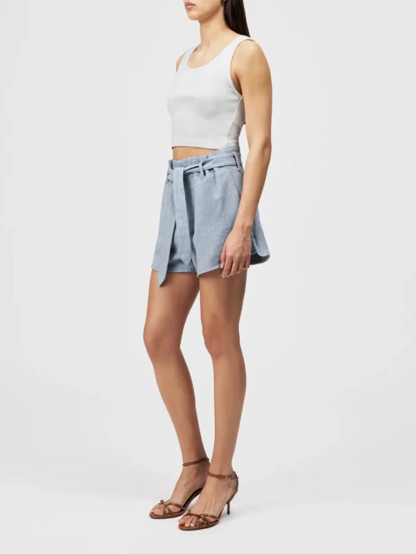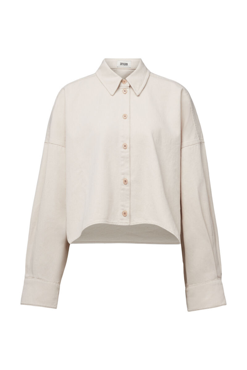 Superleuke blouse van Drykorn. Deze blouse heeft een knoopsluiting aan de voorkant en een kraag. Het is een wat korter model. De blouse is van super zacht beige denim. Combineer met de bijpassende broek.