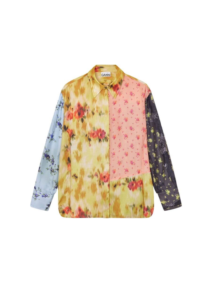 Hele mooie blouse van Ganni! Losvallende blouse met lange mouwen, een kraag en knoopsluiting aan de voorkant. De blouse heeft een design met verschillende bloemenprints en kleurvlakken.