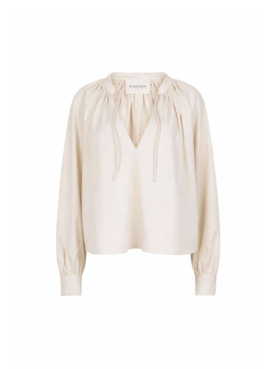 Mooie blouse van Love Stories! Een luchtige, crèmekleurige blouse met een losse pasvorm en een diepe V-hals met strikkoorden. De blouse heeft lange, volumineuze mouwen met strikjes bij de manchetten.
