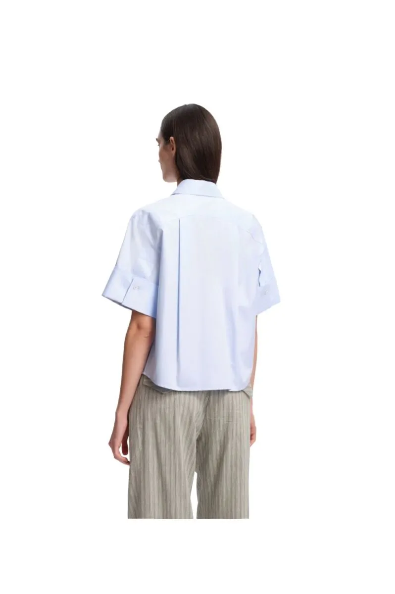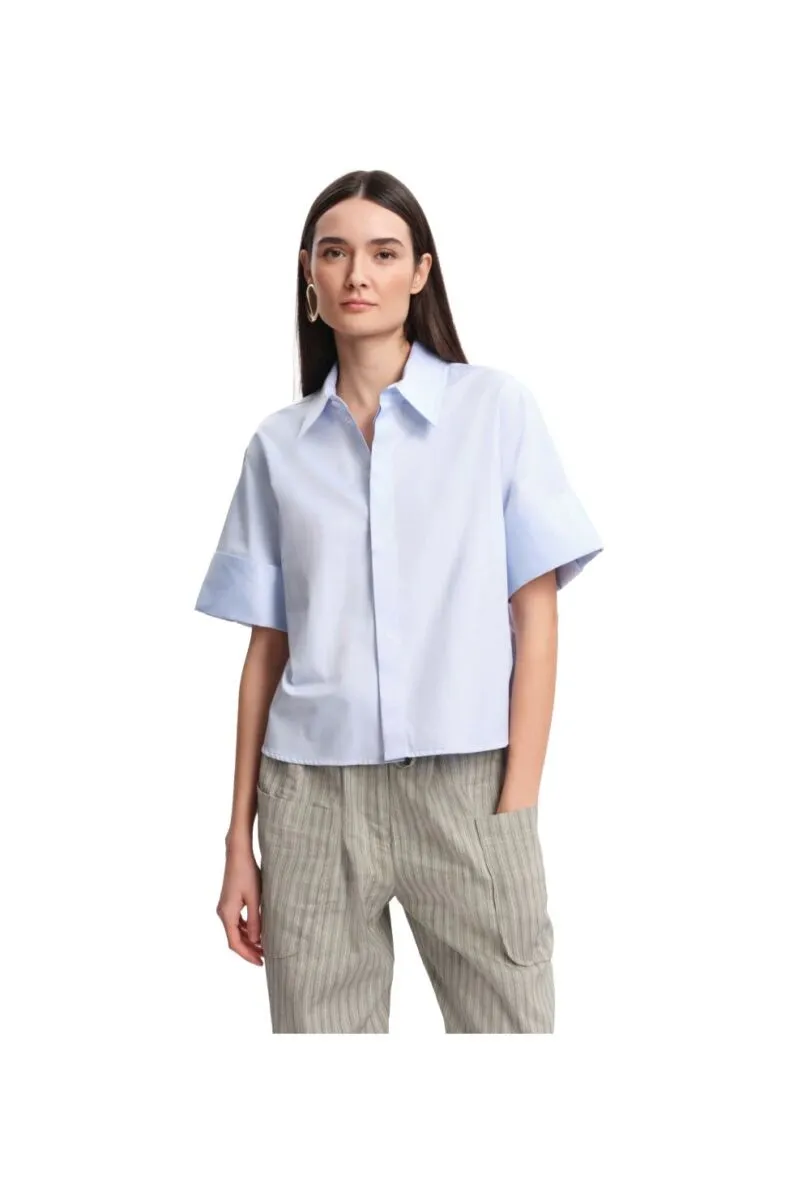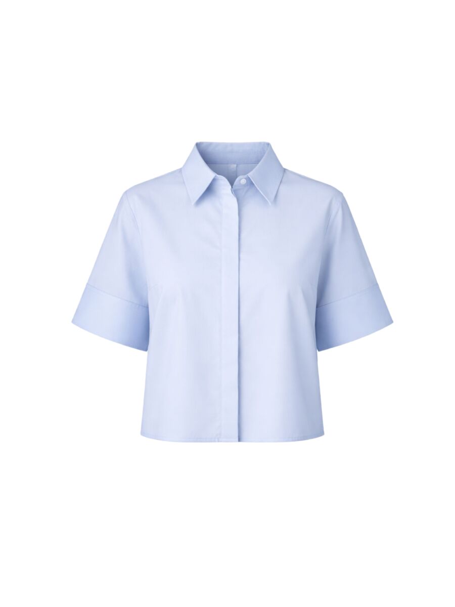 Mooie blouse van Margaux Lonnberg.  Een lichtblauwe blouse met een rechte, licht ruime pasvorm. De blouse heeft een klassieke kraag, een blinde knoopsluiting en wijde, korte mouwen met een brede omslag.
