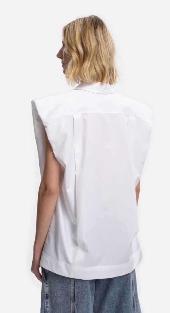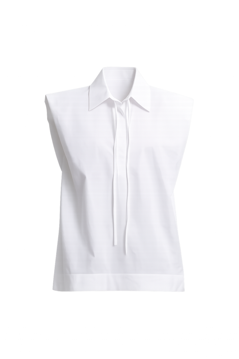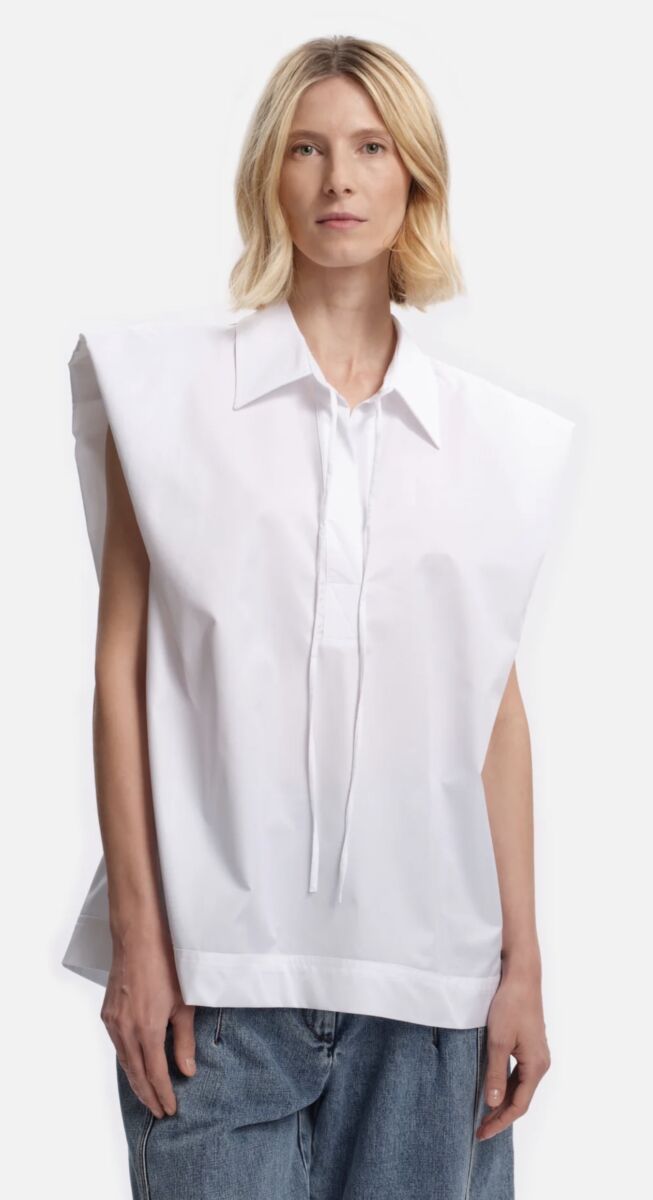 Prachtige blouse van Margaux Lonnberg. De blouse heeft brede, geaccentueerde schouders zonder mouwen en een klassieke kraag. Aan de voorkant zit een blinde knoopsluiting met een lange, smalle striksluiting die naar beneden valt. De onderzijde is recht afgewerkt.