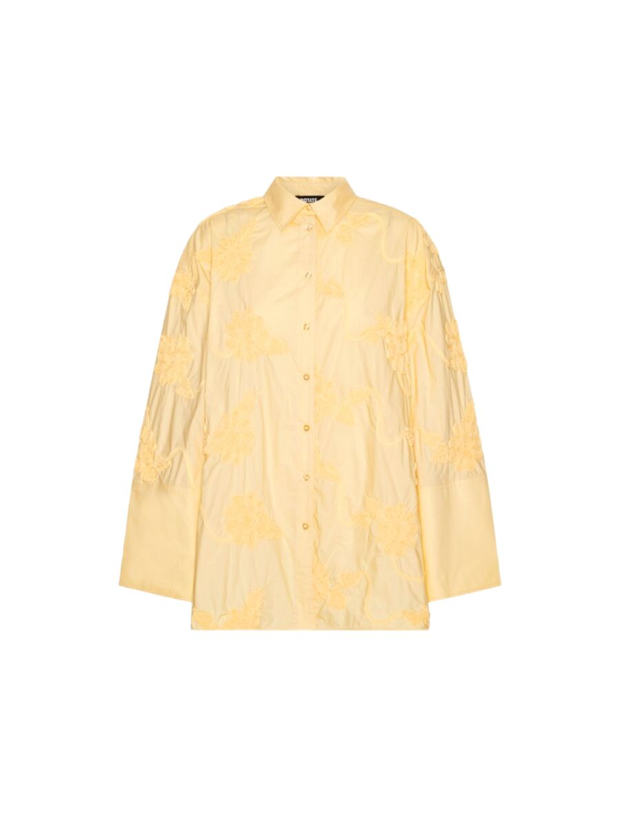 Geweldige gele blouse van Rotate. Deze blouse heeft wijde lange mouwen en kleine knoopjes op de mouw. Hij heeft een kraagje en sluit aan de voorkant met knoopjes. Op de blouse liggen echt prachtige bloemen.