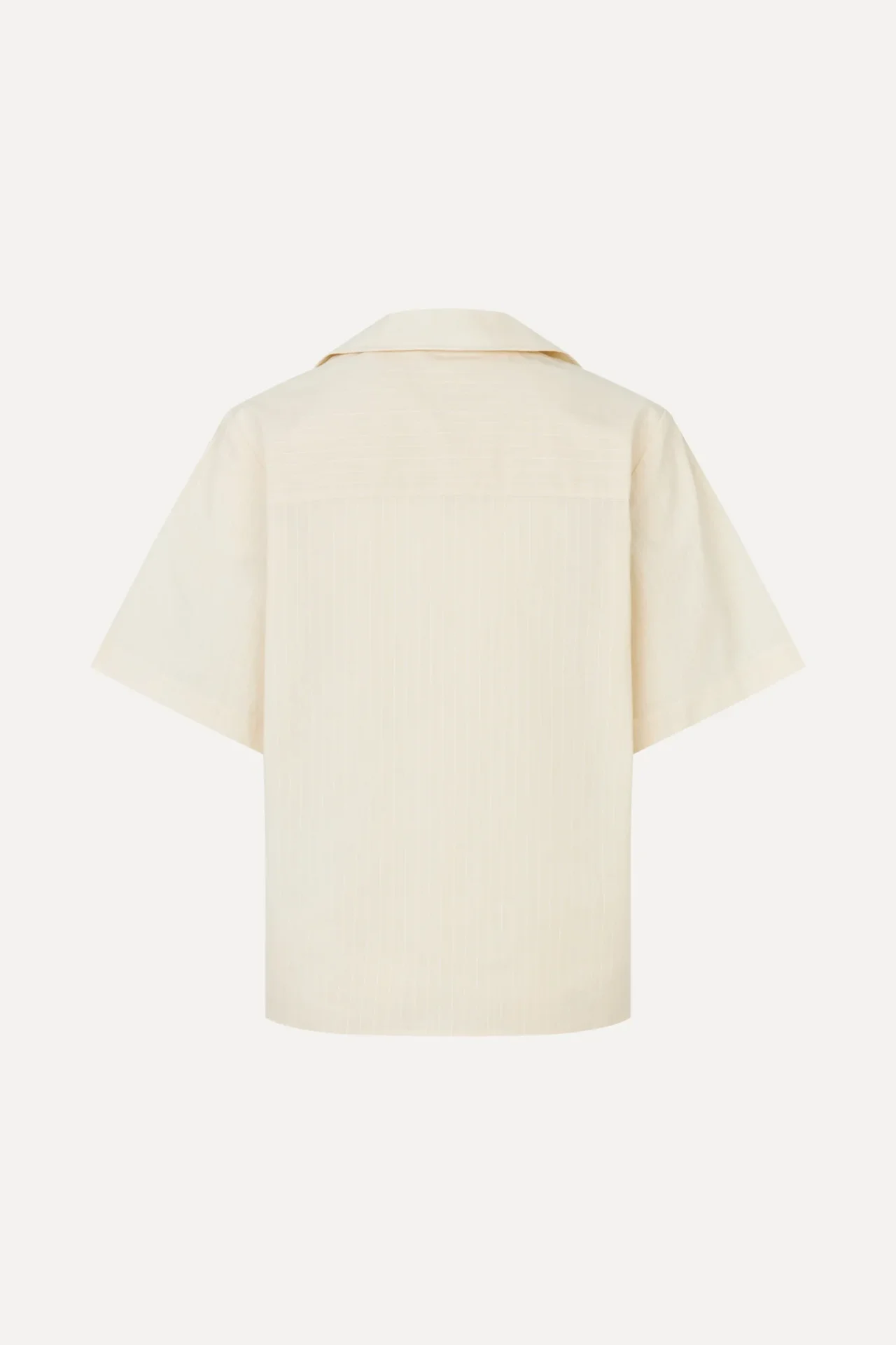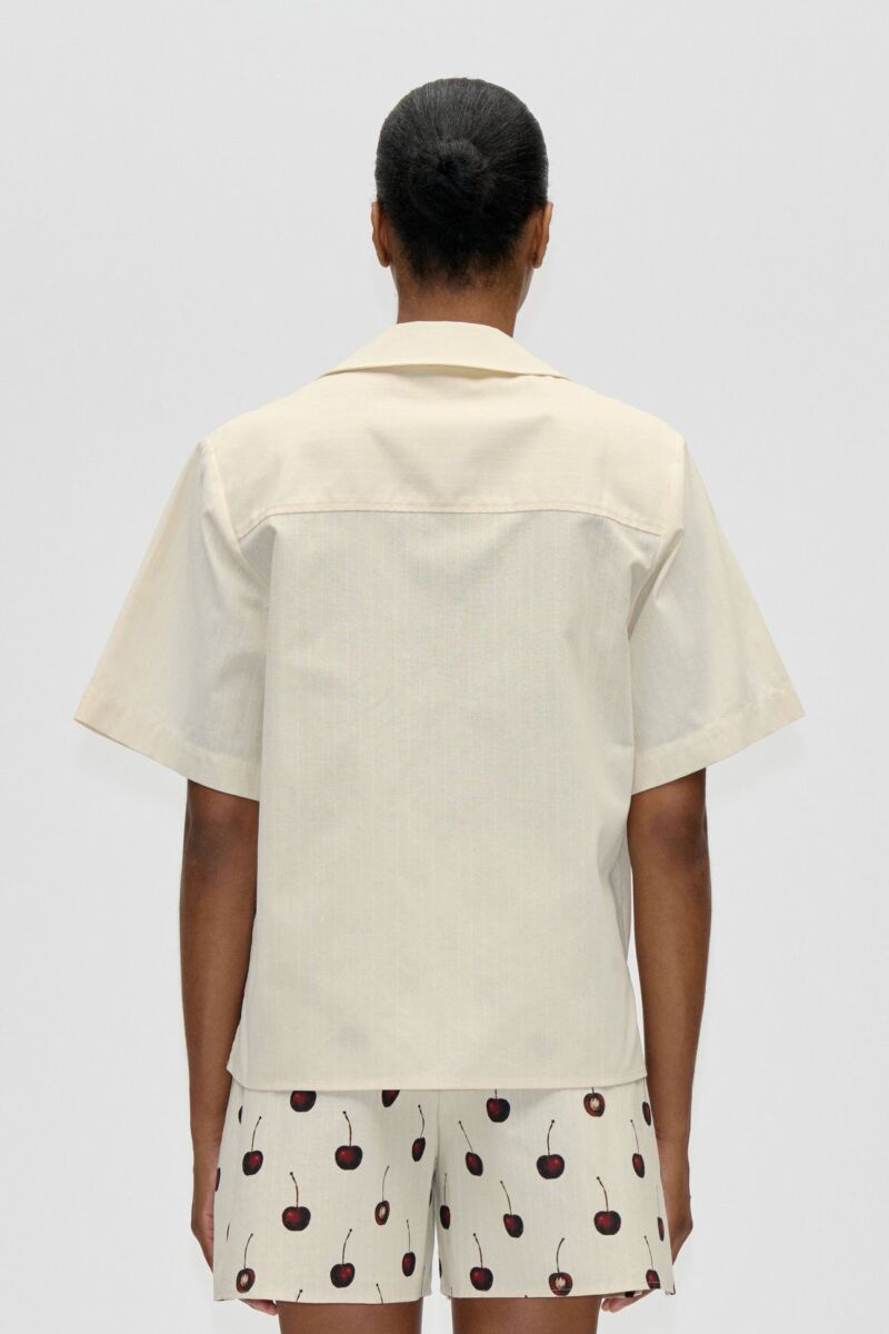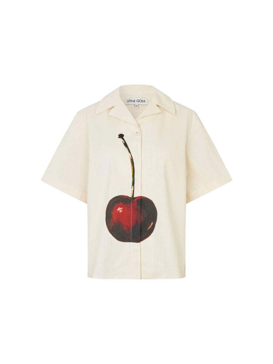 Geweldige top van Stine Goya! De blouse heeft korte mouwen en een klassieke kraag. Op de voorkant staat een grote kersenprint die van de halslijn naar beneden loopt, wat de blouse een speelse en opvallende uitstraling geeft.