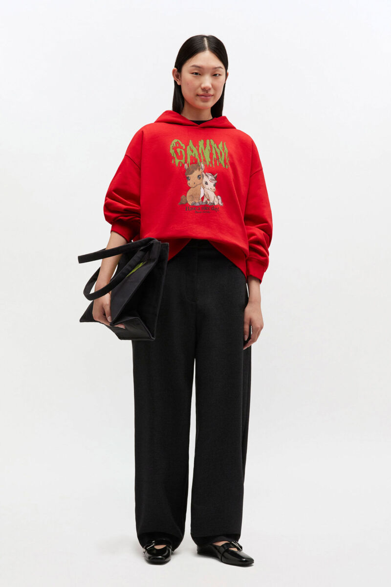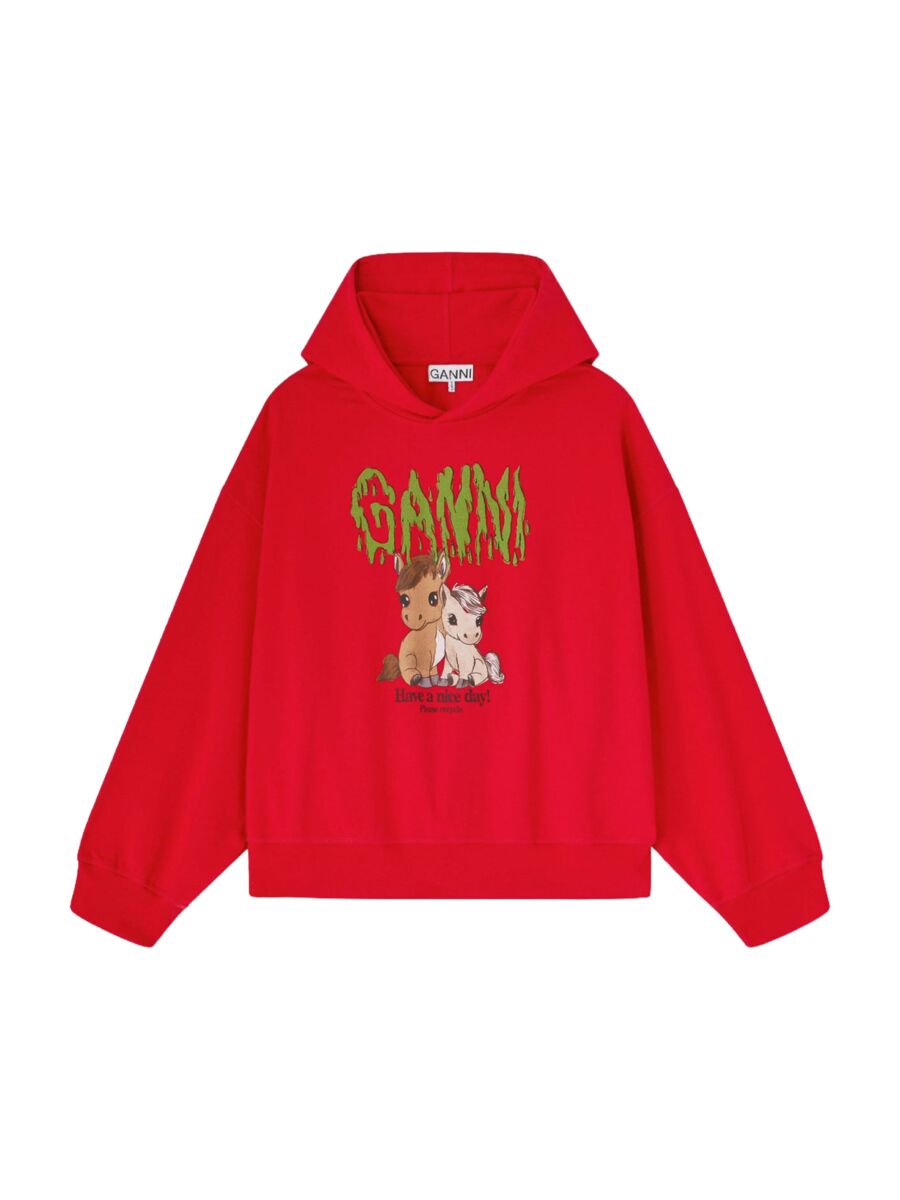 Hoe fantastisch is deze trui van Ganni?! Deze trui heeft lange mouwen en een capuchon. Hij heeft een geweldige felrode kleur en een opdruk met super schattige pony’s! Op de voorkant staat het Ganni logo in het groen.