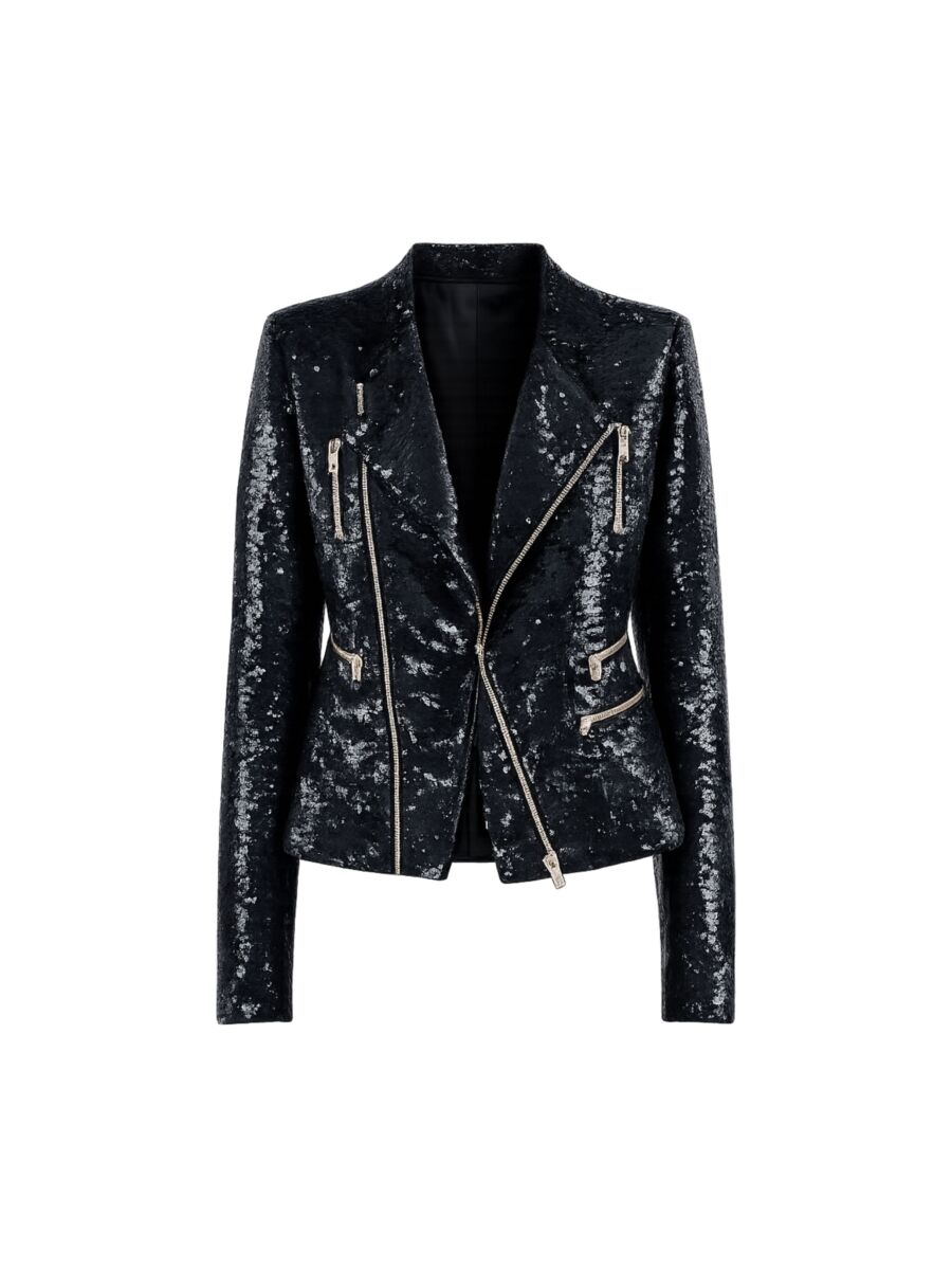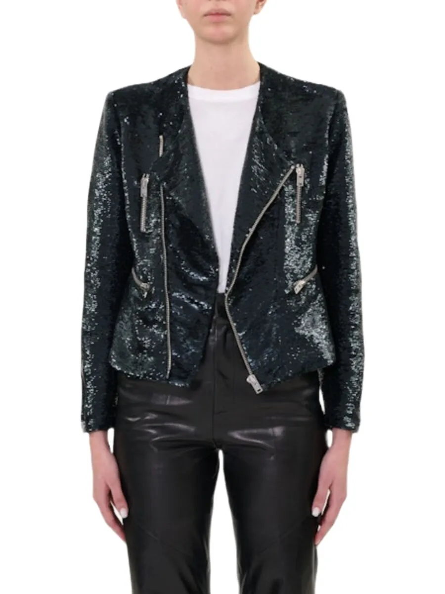 Prachtig jasje van Iro. Dit zwarte jasje heeft lange mouwen en schoudervullingen, wat een mooi chique effect geeft! Het jasje heeft zilveren hardware en pailletten over heel het jasje!