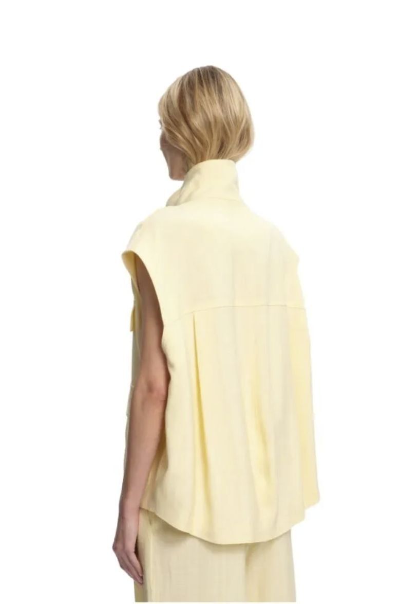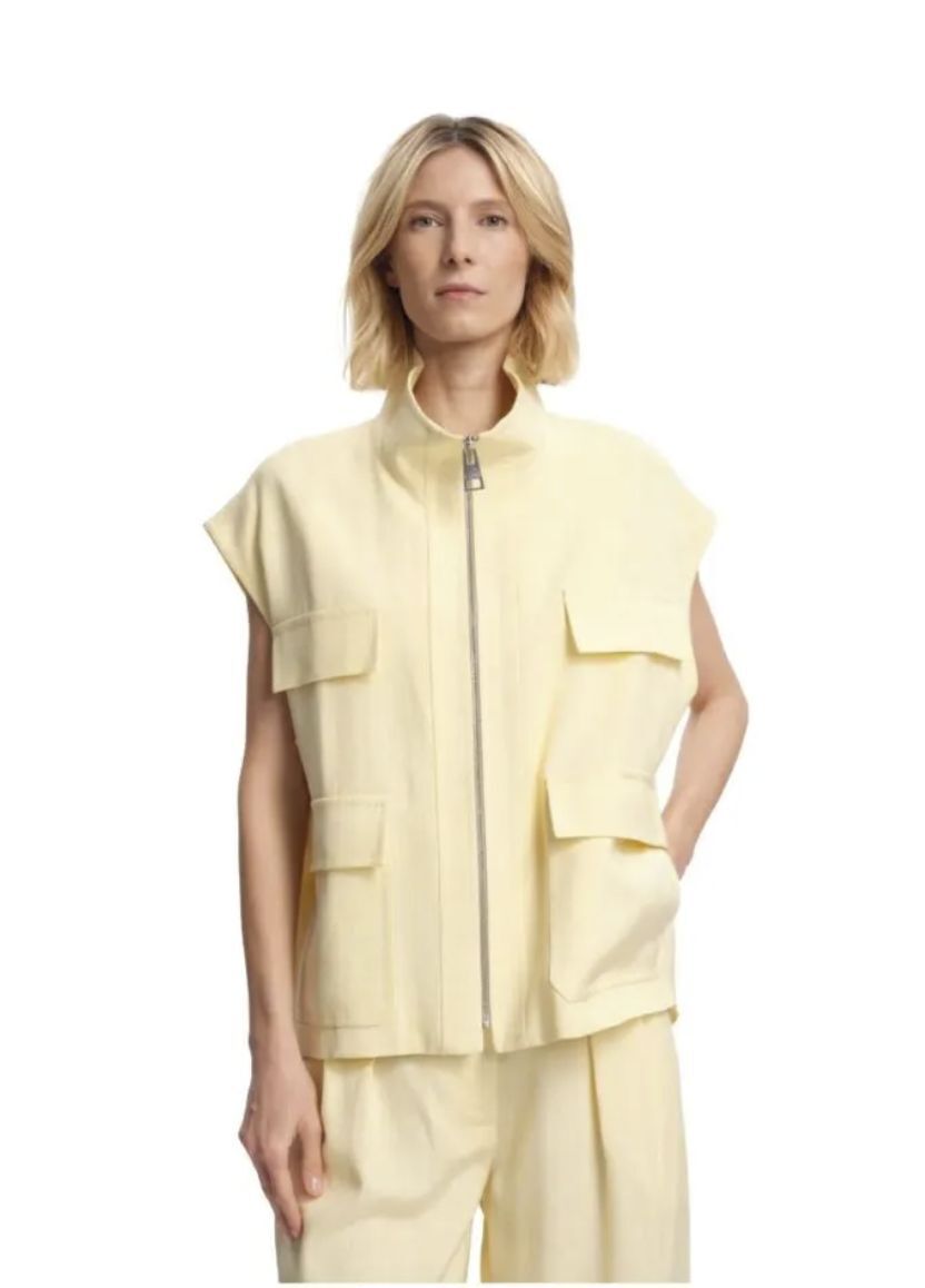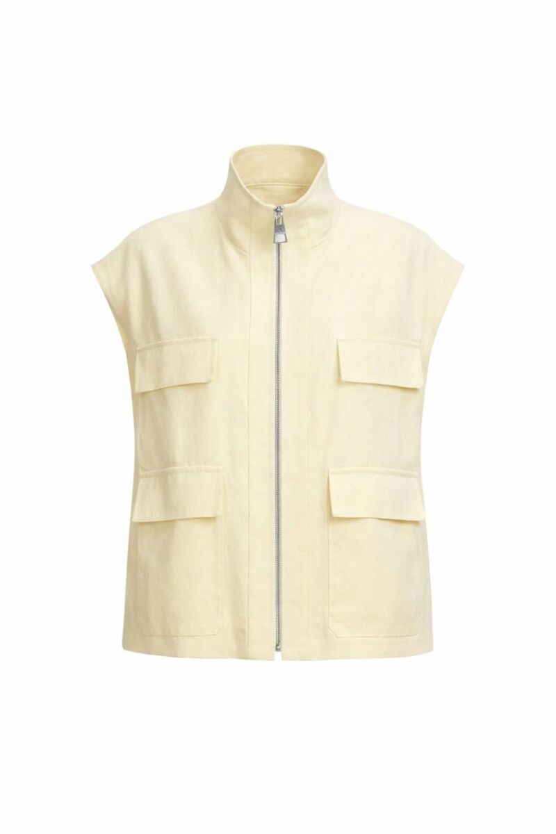 Mega leuk jack van Margaux Lonnberg. Het is een lichtgele, mouwloze blouson met een rechte, ruime pasvorm. Hij heeft een opstaande kraag en een zilverkleurige ritssluiting aan de voorkant. Aan de voorzijde zitten meerdere grote opgestikte zakken met klep.
