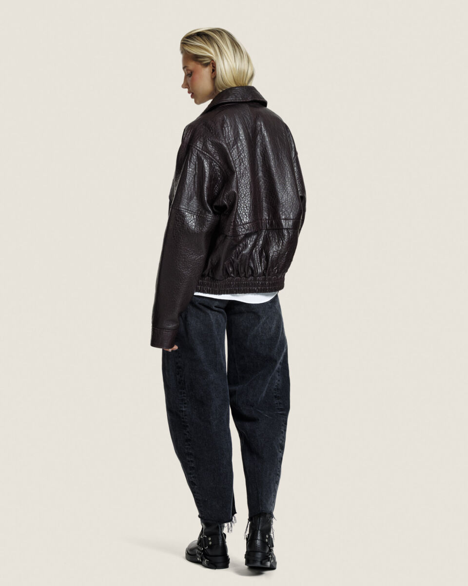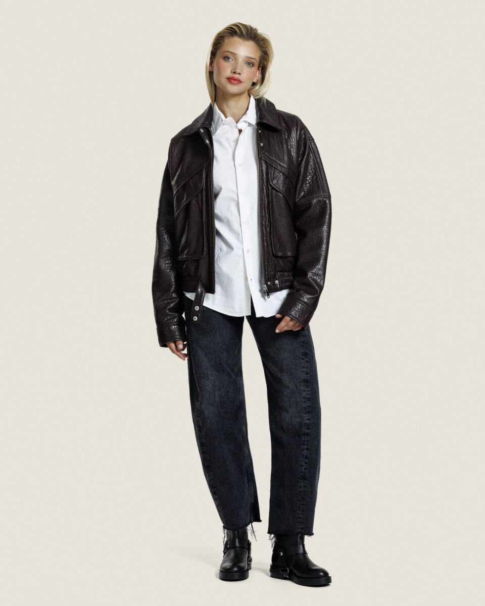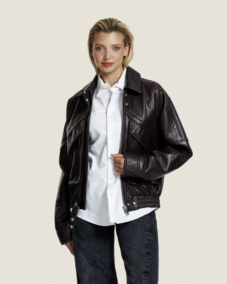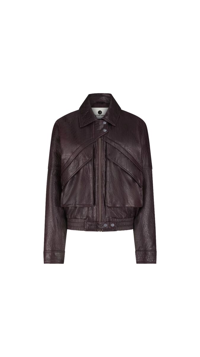 Prachtig jack van Alter Ego! Deze leren jas heeft een hele stoere structuur en straalt een rijk en verfijnd karakter uit. Aan de voorkant zitten grote zakken, die sluiten met druk knopen.