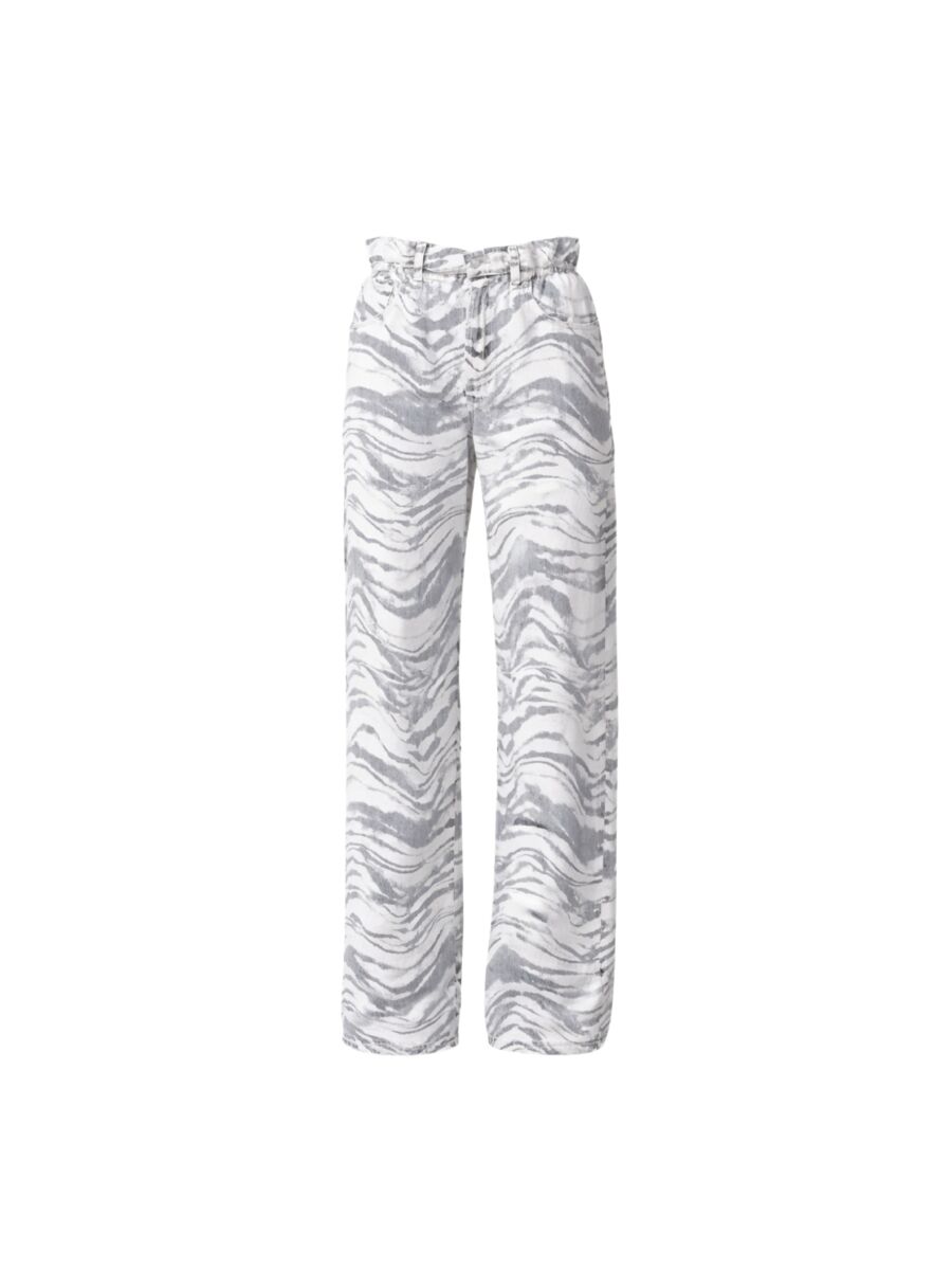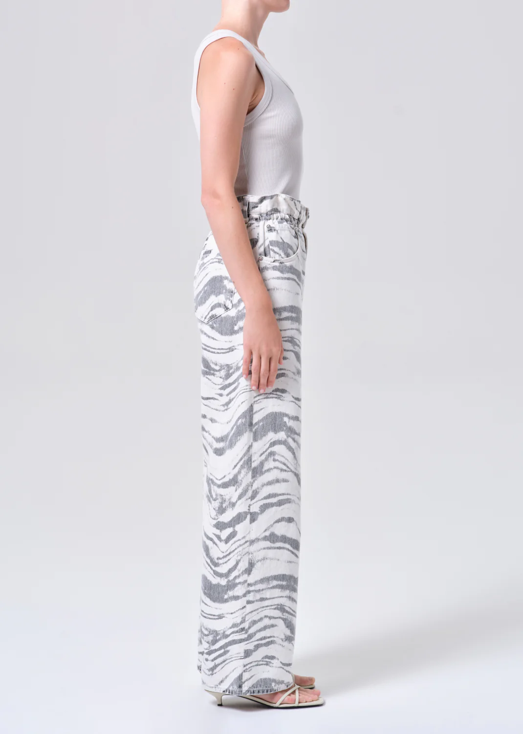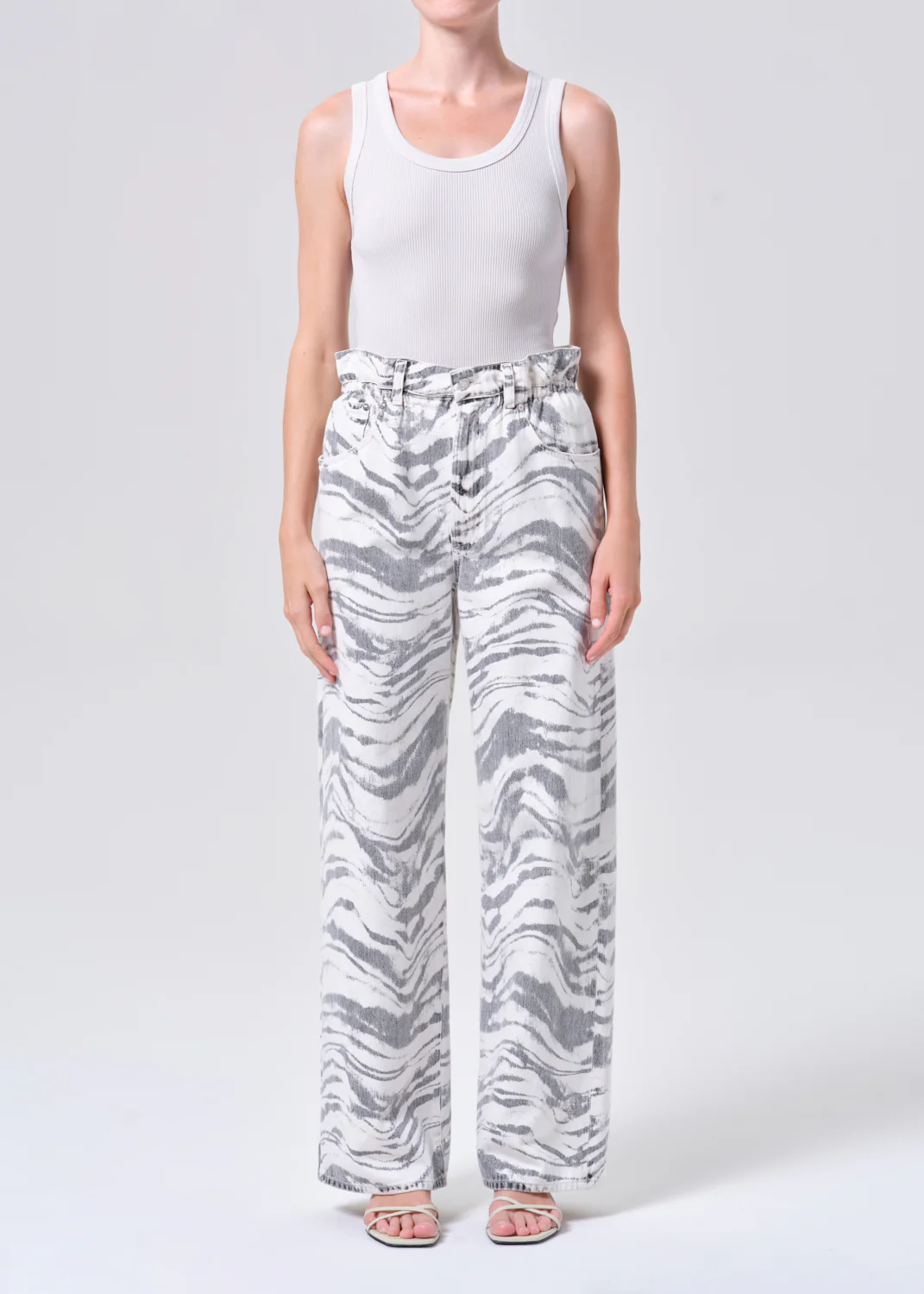 Prachtige jeans van Agolde. Een high-waist jeans met een rechte, relaxte pijp. De tailleband heeft een licht geplooid detail en de broek is uitgevoerd in een vervaagde zebraprint.