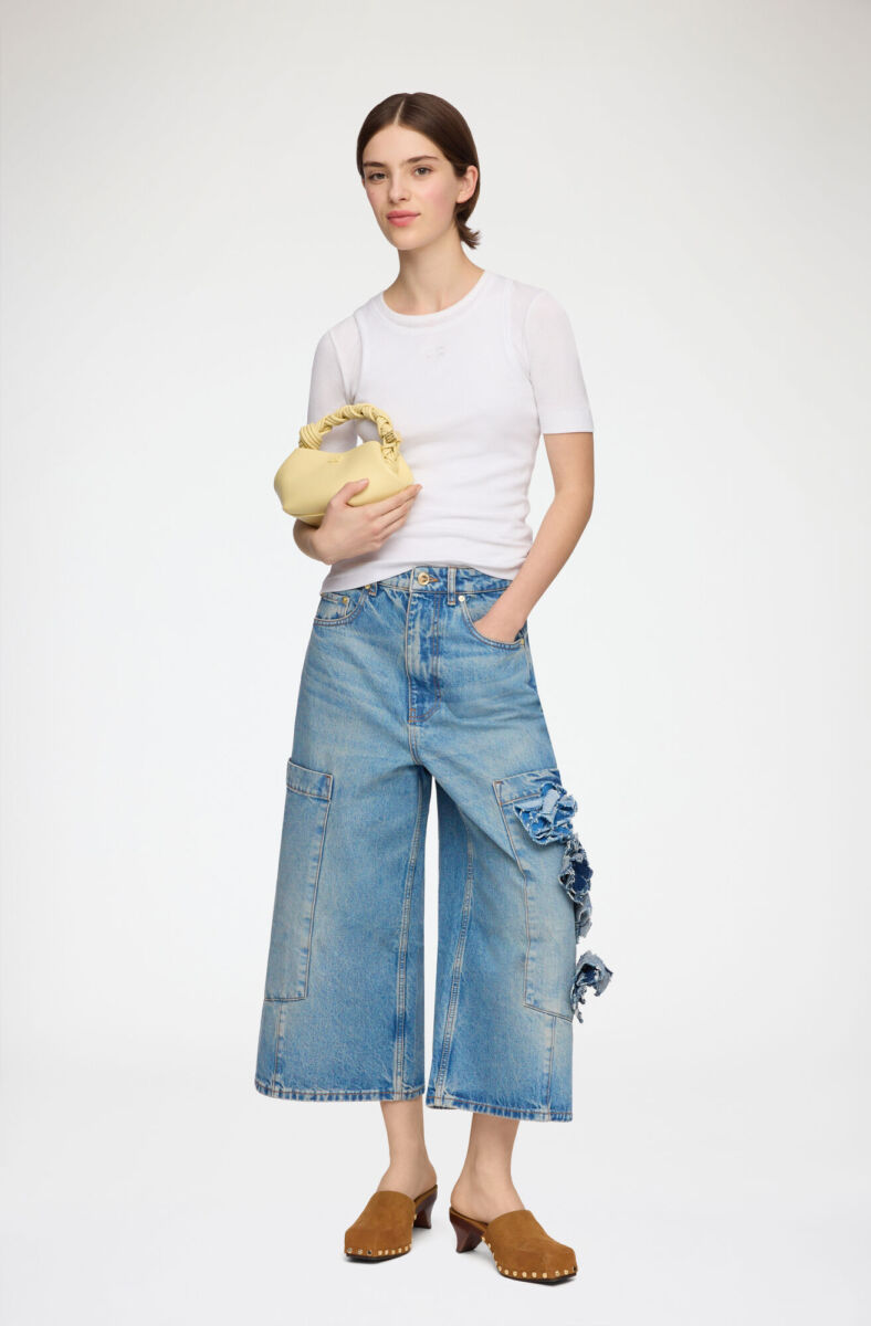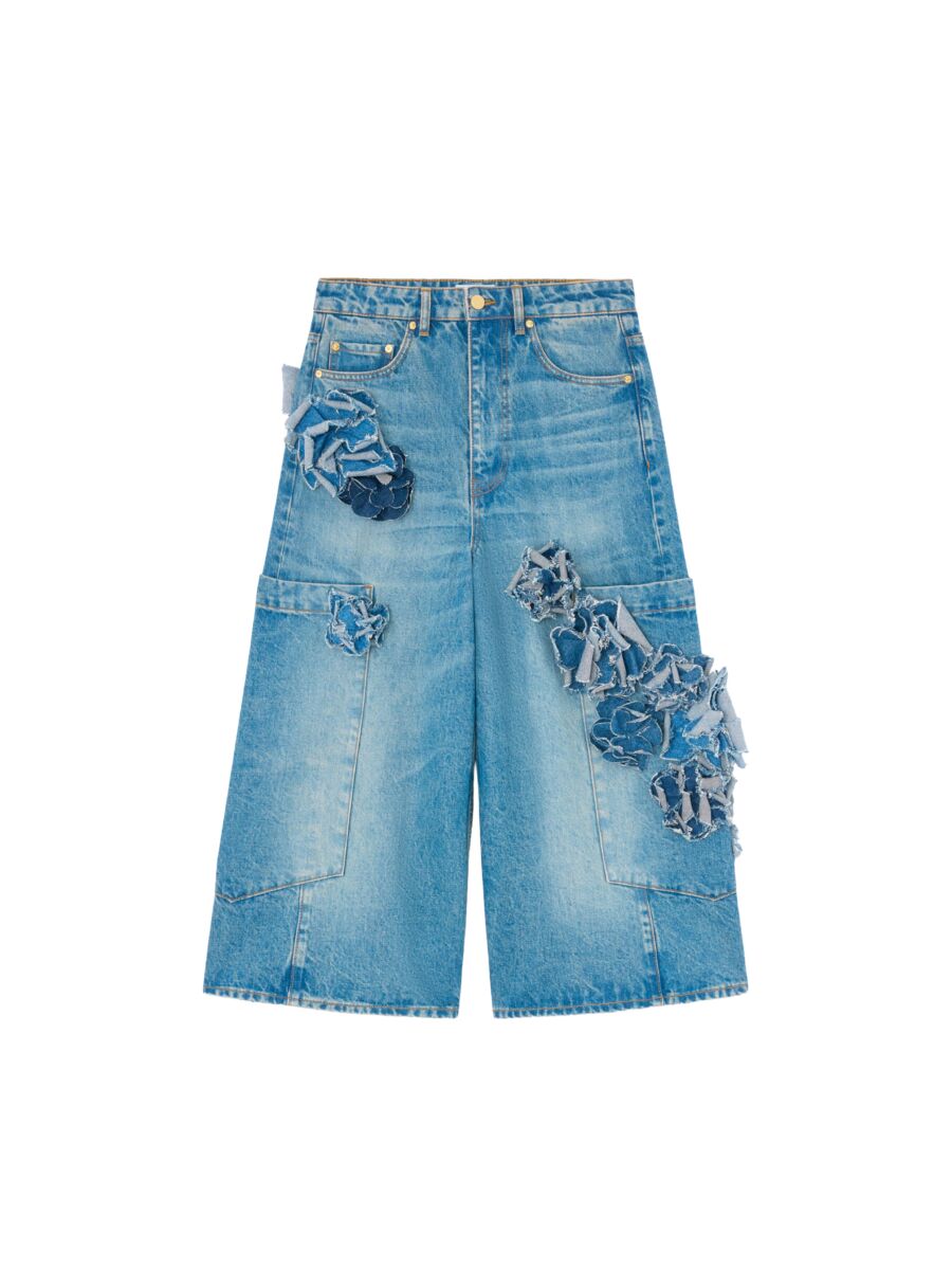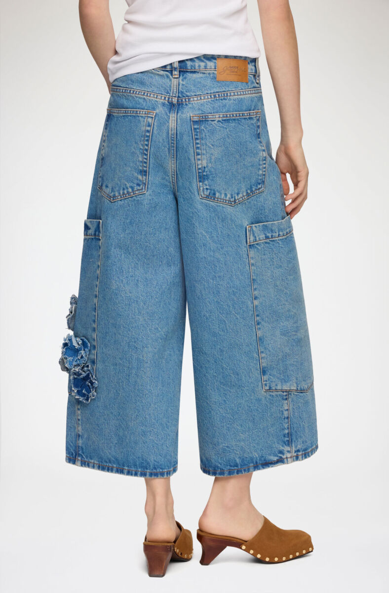 Prachtige jeans van Ganni. Deze jeans heeft een middelhoge taille en een cropped lengte. De broek heeft een super mooie denim wassing en prachtige denim bloemen erop verwerkt. Als extra detail heeft hij nog twee grote zakken aan de zijkant.