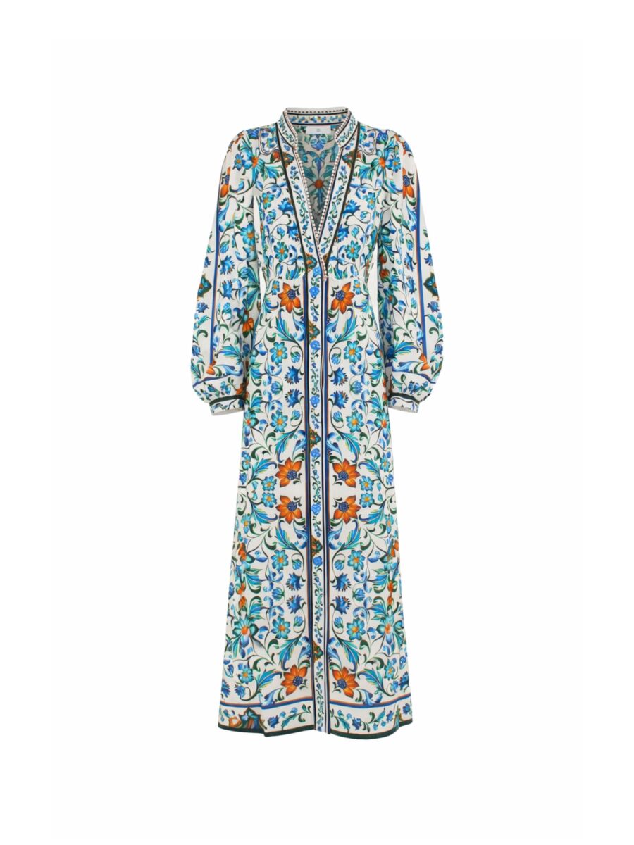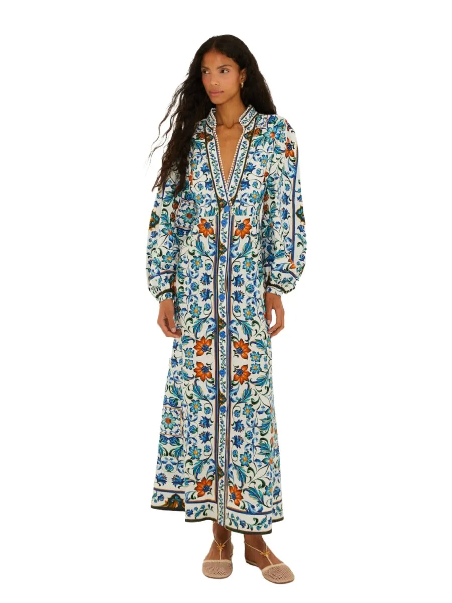 Prachtige jurk van Farm Rio! Deze soepelvallende jurk heeft een V-hals met een hoge kraag. Hij heeft een mooie kleurrijke bloemenprint met blauw en wit. De jurk sluit met knopen.