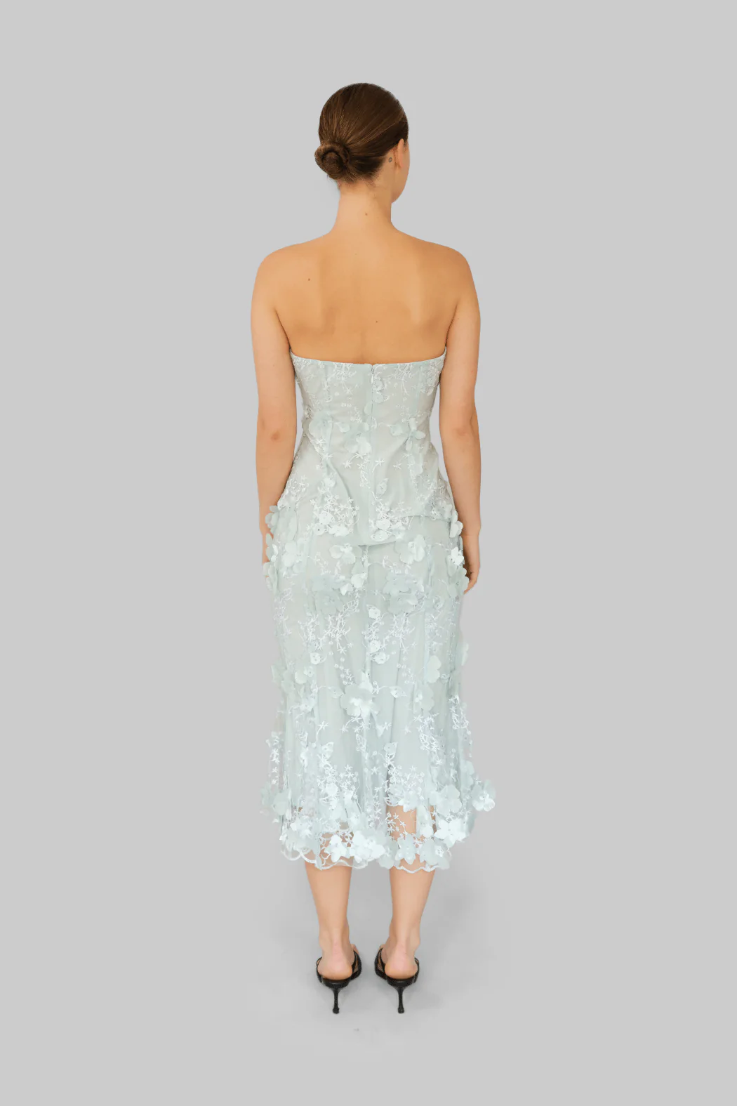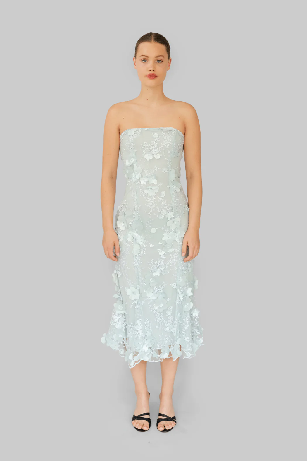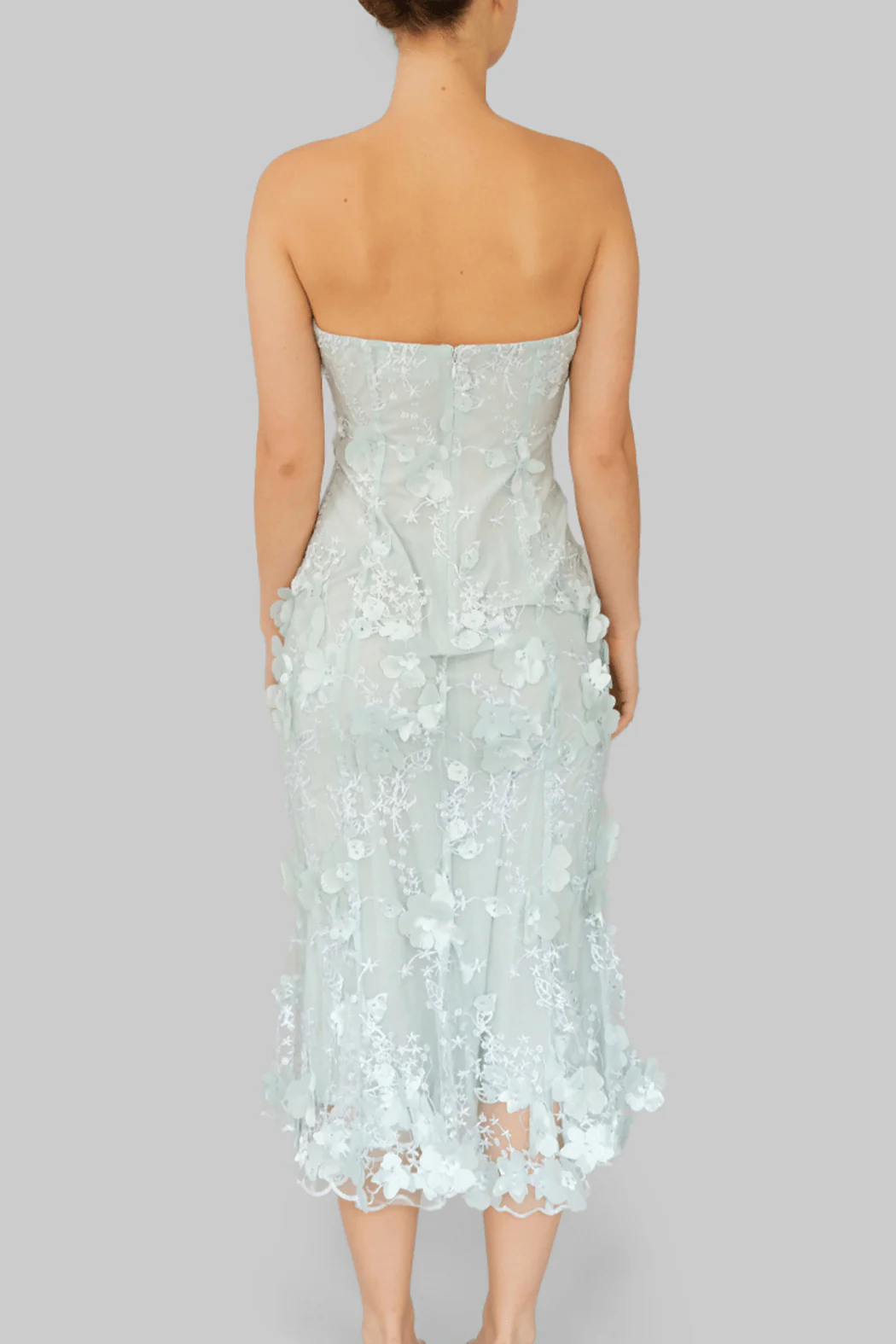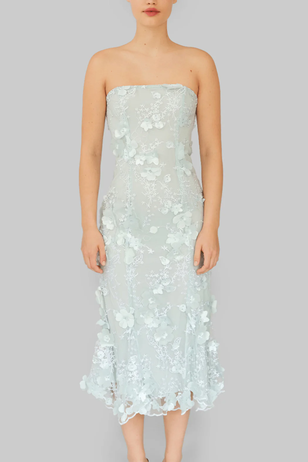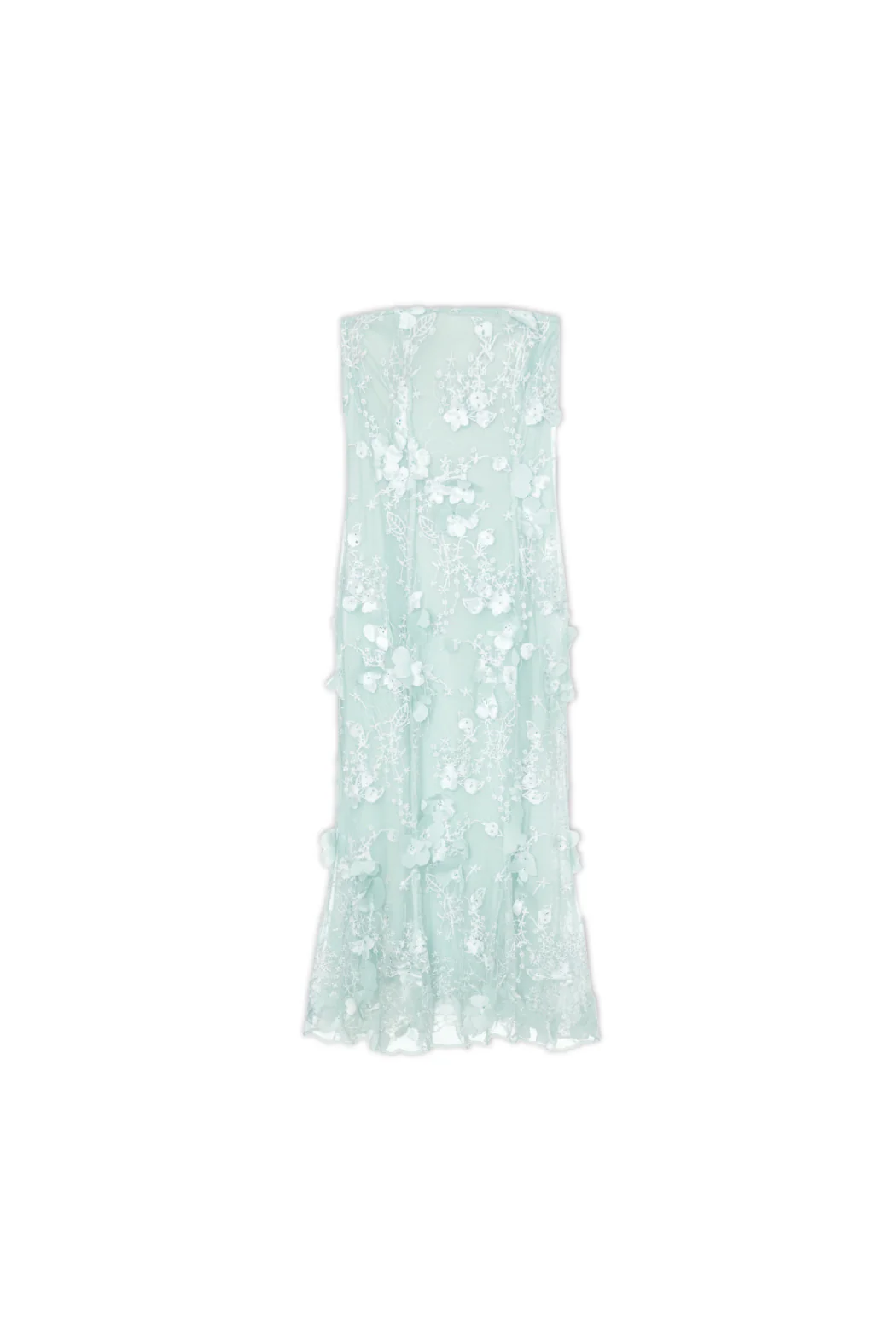 Prachtige jurk van OpéraSPORT. De jurk heeft is strapless en heeft een getailleerd silhouet. Hij is gevoerd en heeft een ritssluiting aan de achterkant. De jurk heeft een doorzichtig bloemenkant en hele mooie 3D bloemenapplicaties.