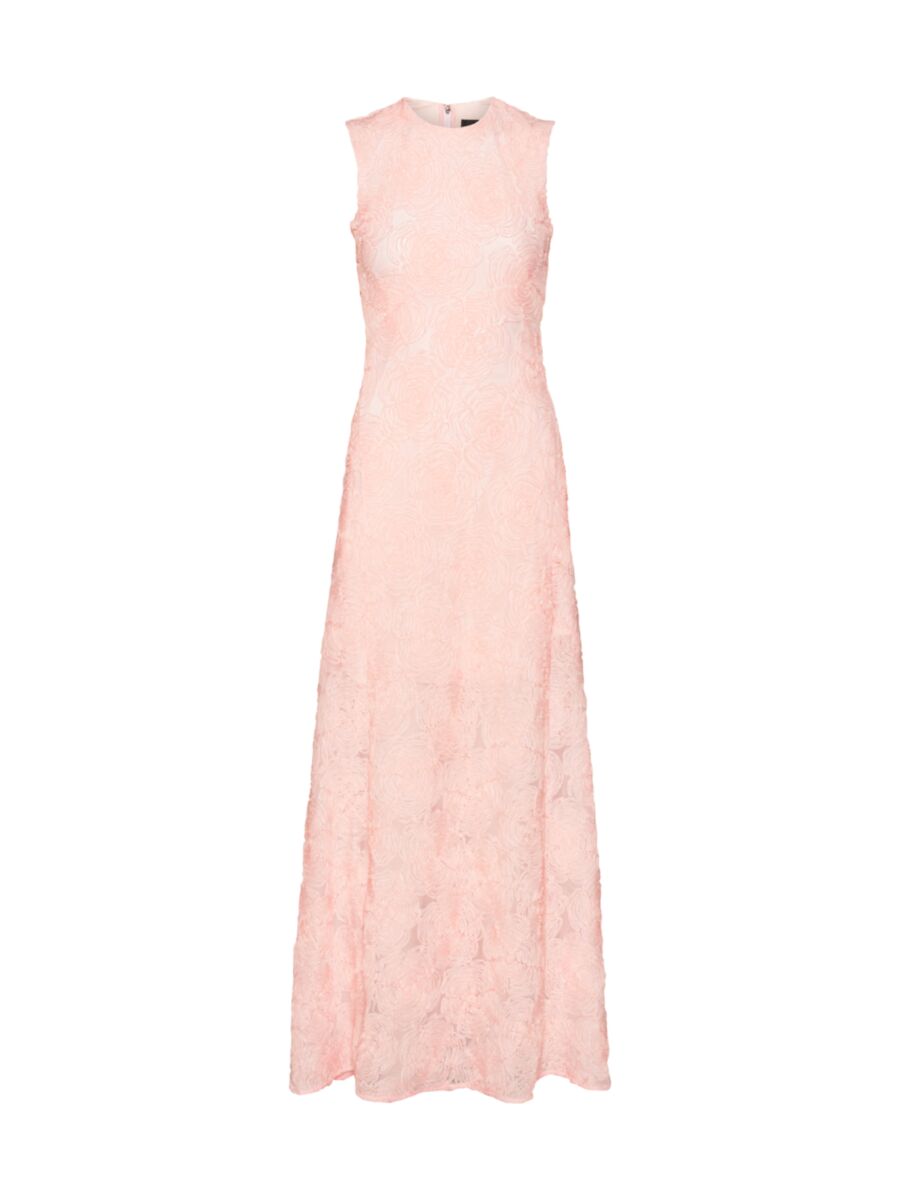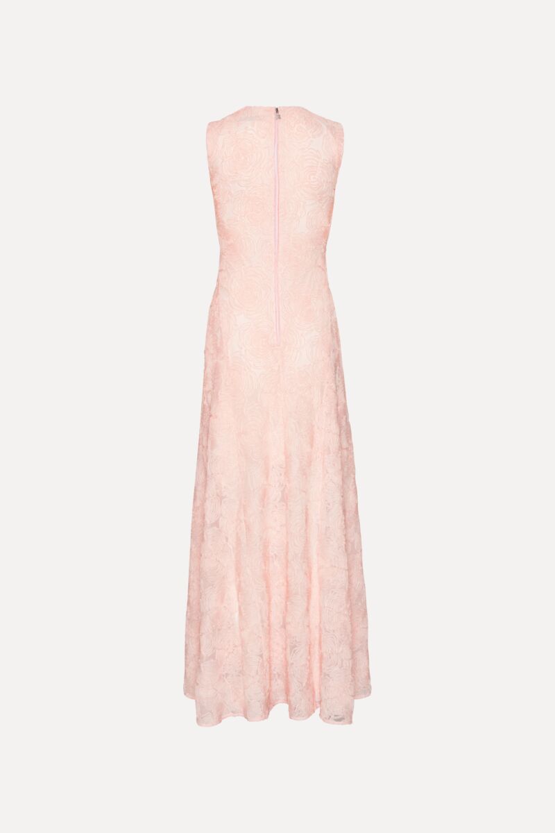 Prachtige jurk van Rotate. Deze roze jurk heeft een maxi lengte en zit super mooi aangesloten. De jurk is mouwloos, heeft een prachtig bloemen patroon en heeft een hoge kraag. De jurk heeft een ritssluiting aan de achterkant.