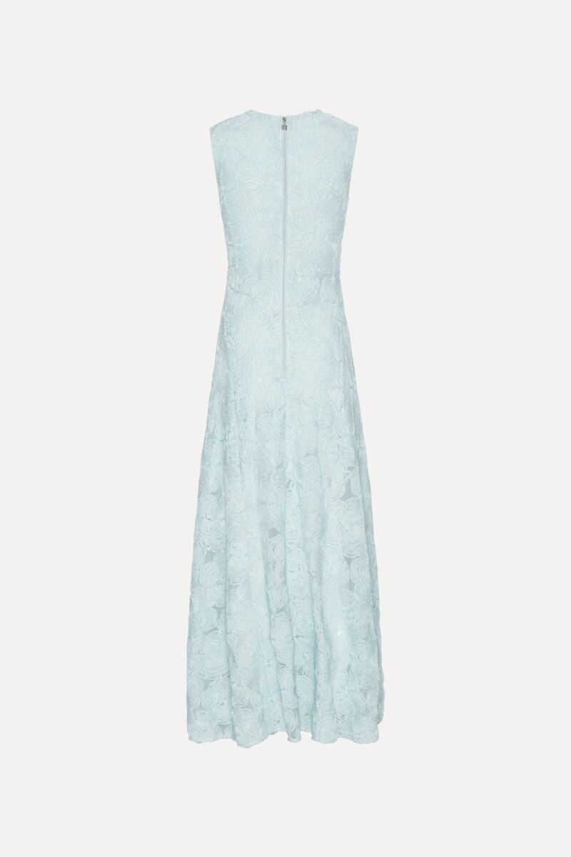 Prachtige jurk van Rotate. Deze blauwe jurk heeft een maxi lengte en zit super mooi aangesloten. De jurk is mouwloos, heeft een prachtig bloemen patroon en heeft een hoge kraag. De jurk heeft een ritssluiting aan de achterkant.