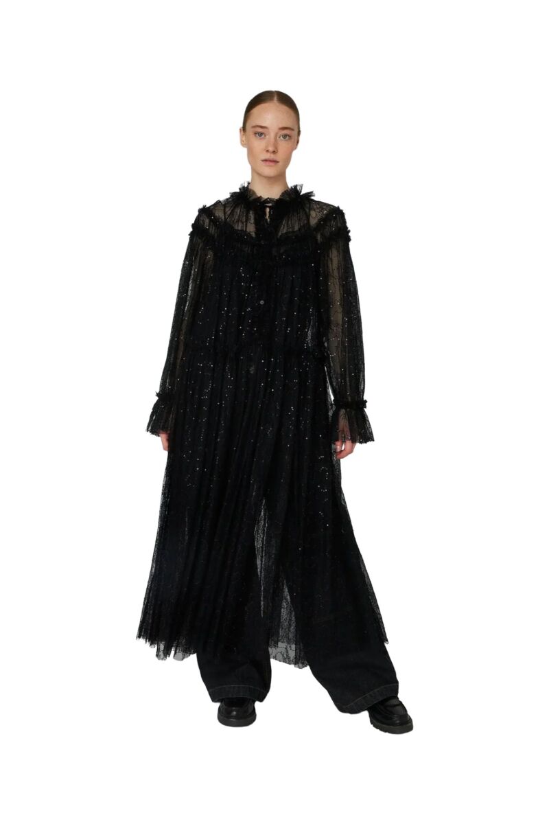 Hoe prachtig is deze jurk van Stella Nova?! Deze maxi-jurk heeft lange mouwen en een prachtige kanten stof met super mooie pailletten. Ook heeft deze geweldige jurk een uitlopend mouwtje, ruffels en sluit aan de voorkant met een knoopjes. Hij schijnt licht door, dus heel leuk te combineren met een Love Stories bralette eronder.