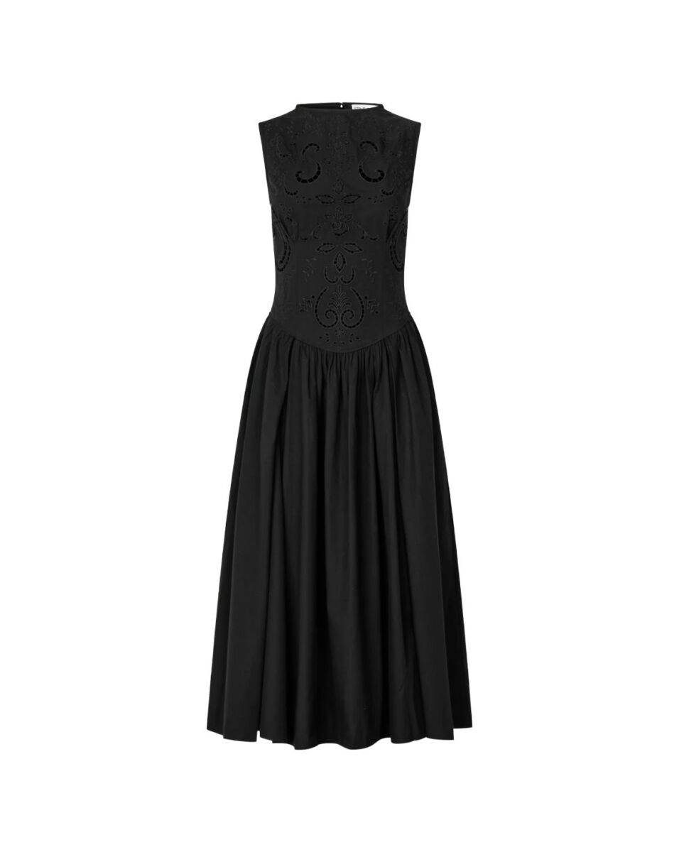 Prachtige jurk van Stine Goya. Deze lange jurk is mouwloos en heeft een aangesloten lijfje met boderie erop. De jurk loopt wijd uit.