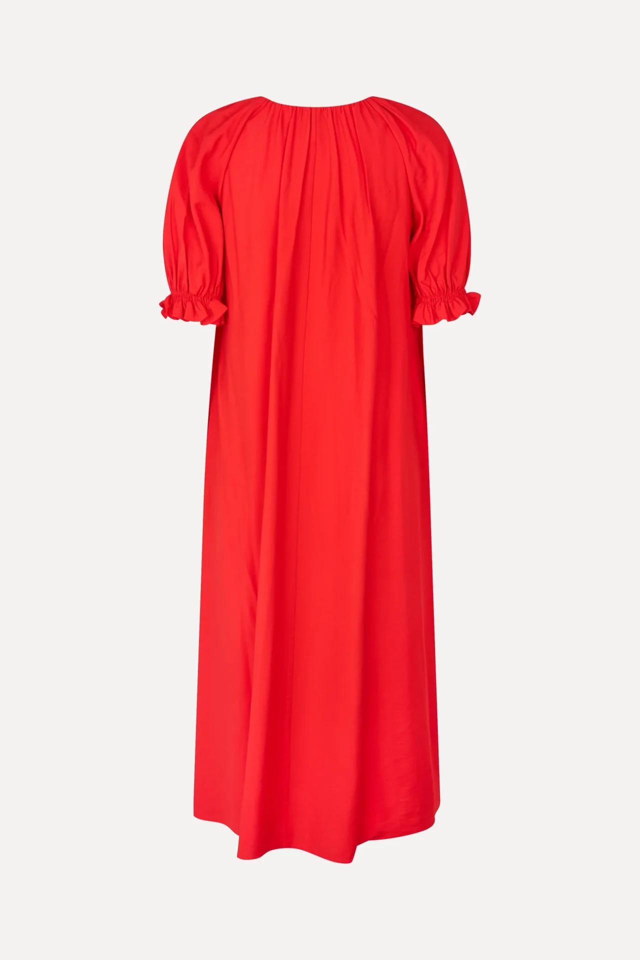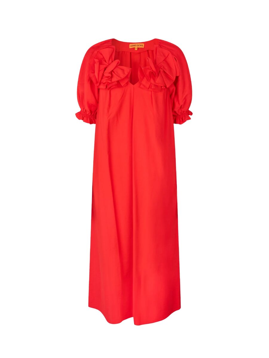 Hele mooie jurk van Stine Goya! Het is een felrode jurk met een losse, rechte pasvorm en een V-hals. De jurk heeft korte pofmouwen met elastiek en opvallende ruffled details bij de halslijn die zorgen voor een speelse en volumineuze uitstraling.