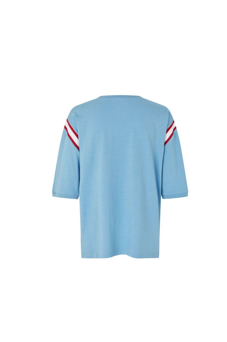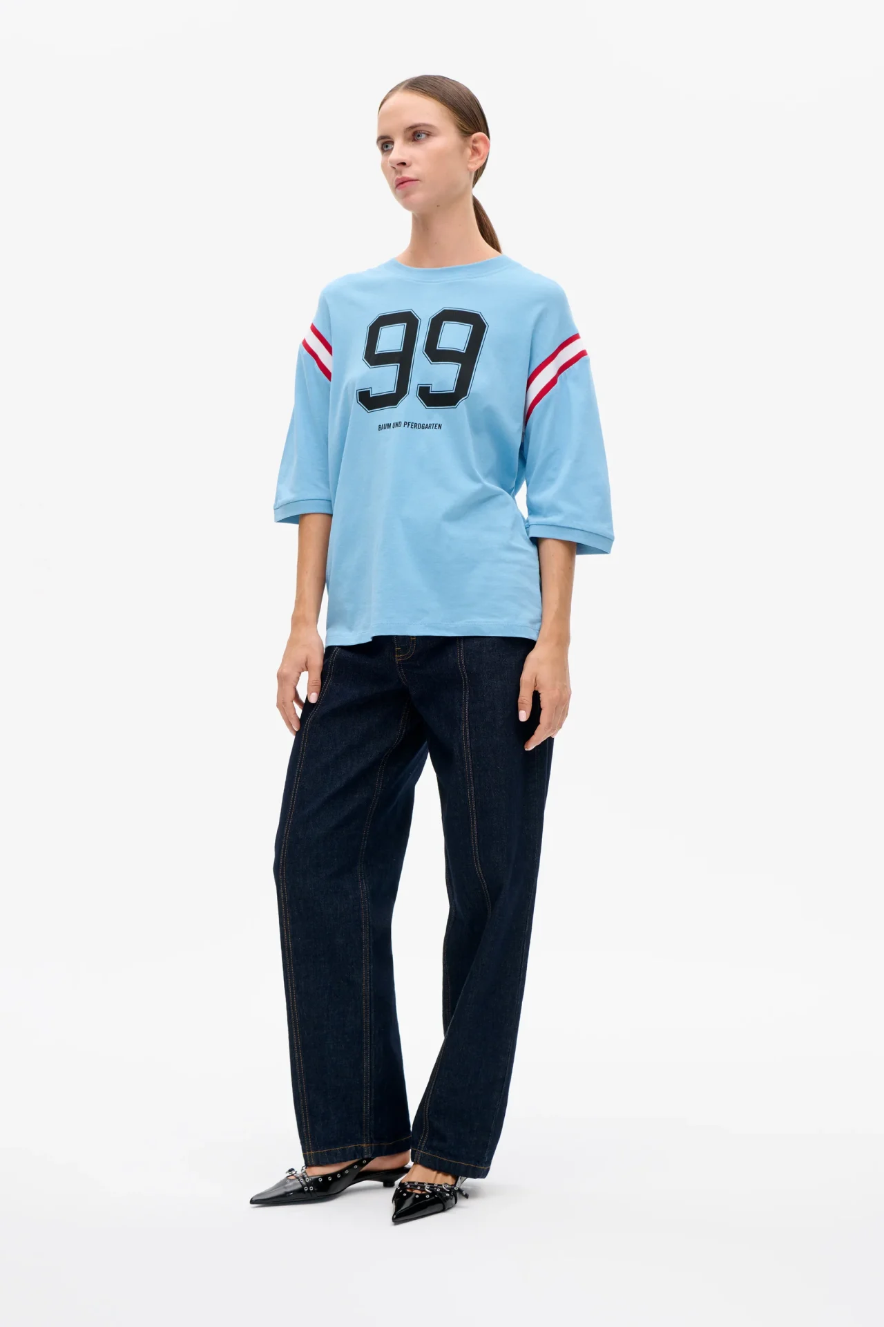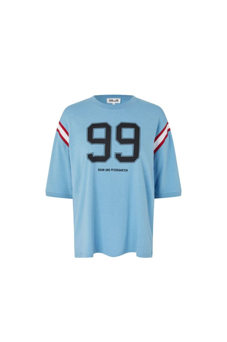 De t-shirts van Baum und Pferdgarten zijn altijd goed en overal mee te combineren. Dit shirt heeft een lichtblauwe kleur en een football jersey look. Hij heeft rood en witte details op de mouw. Het t-shirt heeft korte mouwen en een normale fit.
