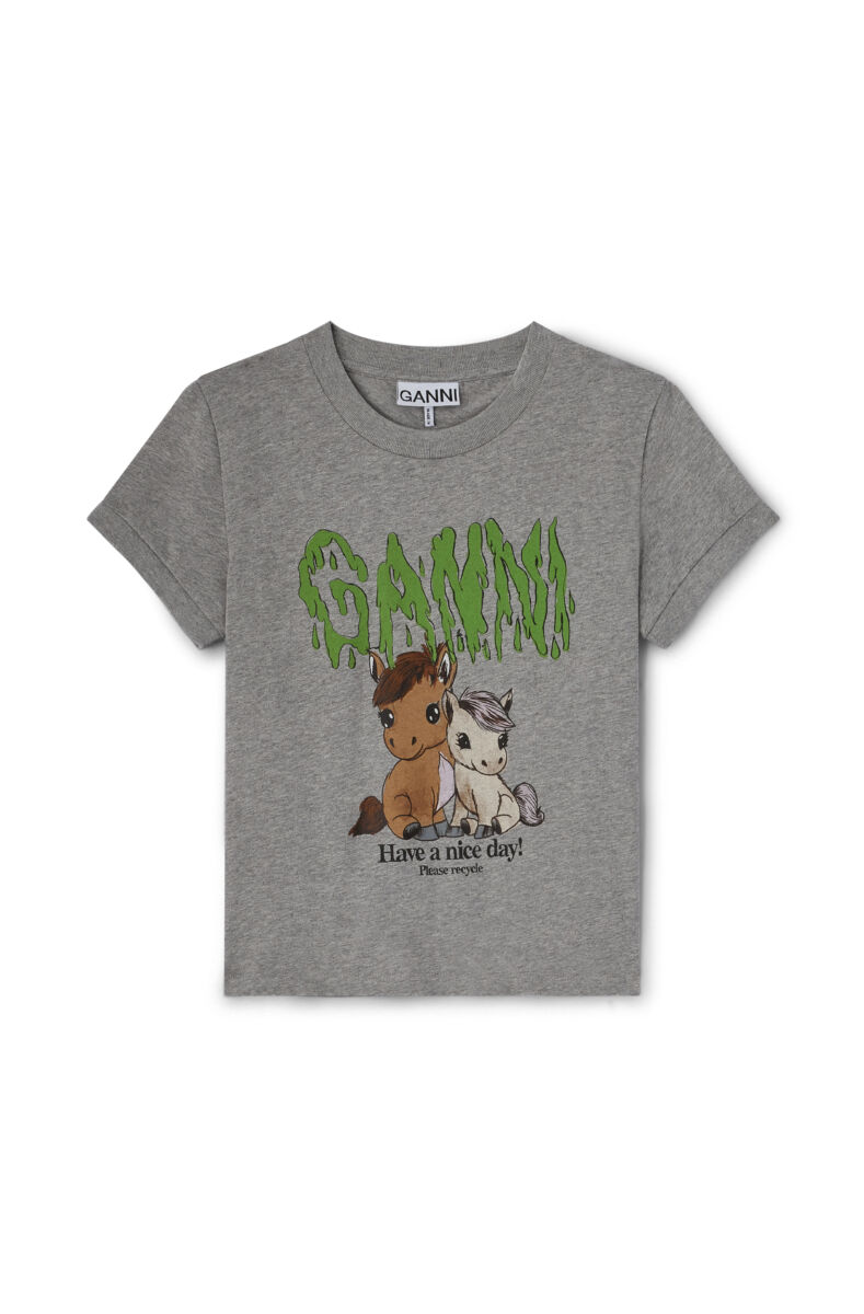 De T-shirts van Ganni zijn altijd leuk! Dit grijze shirtje heeft korte mouwen en een opdruk met paardjes! Op de borst staat het Ganni logo in het groen. Dit t-shirt is een baby tee, dit houdt in dat het shirt een kleine, aangesloten pasvorm heeft.