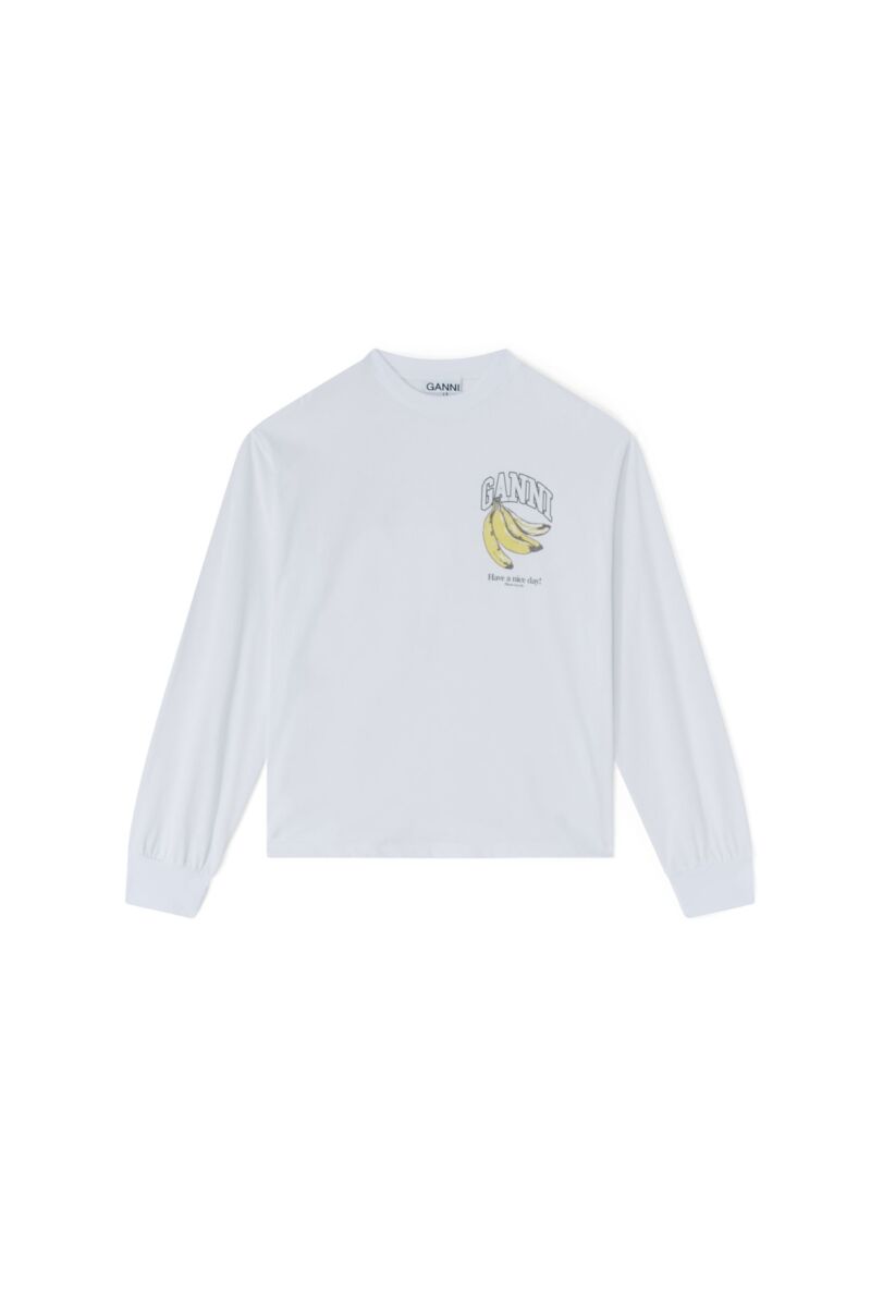 Leuke longsleeve van Ganni! Dit t-shirt heeft een ronde hals en lange mouwe. Het shirt heeft een gekleurde opdruk op de voorkant en op de mouwen! Ganni’s t-shirts vallen altijd wat ruimer dus als je niet houdt van een oversized fit adviseren we je een maatje kleiner te nemen.
