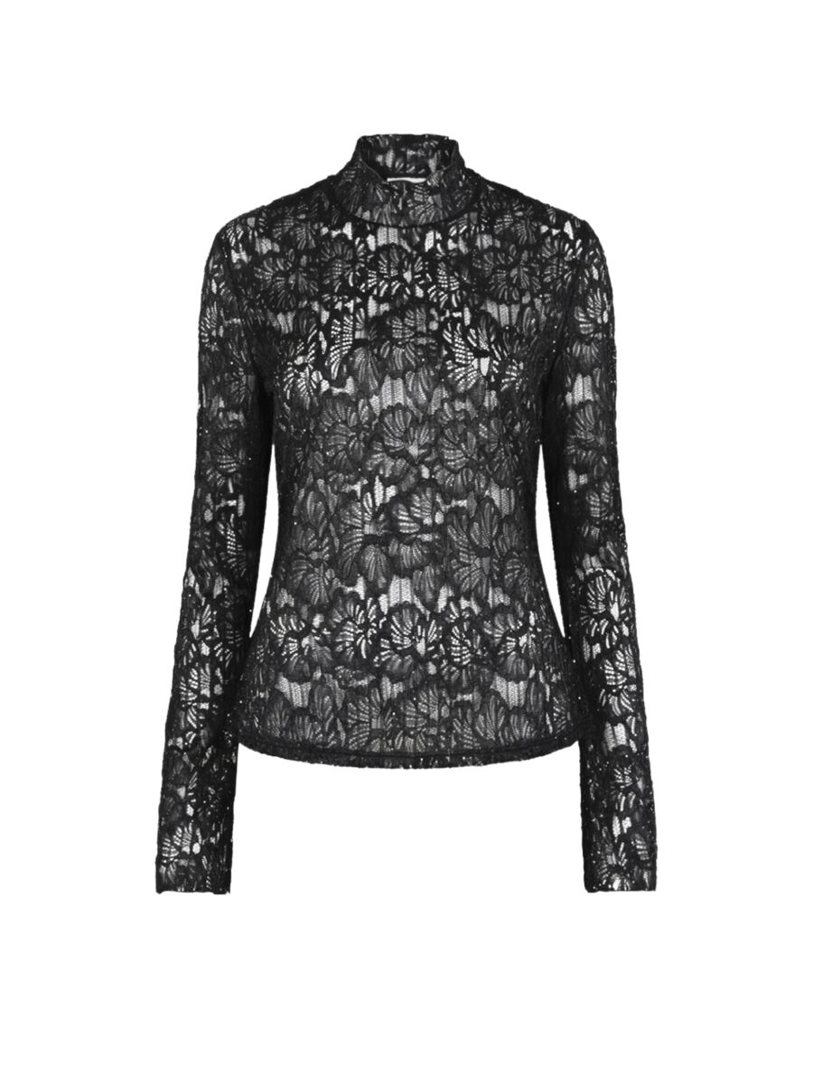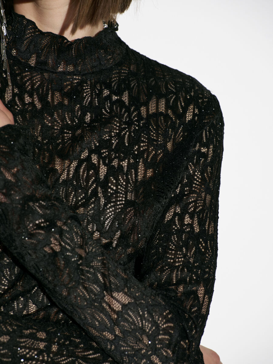 Prachtige top van Dante6. Hij heeft een hogere opstaande kraag en is helemaal van kant. Hij heeft ook strass en de stof heeft stretch. Draag hem onder een blazer of style hem met een gebreide trui voor een subtiel, sprankelend effect.