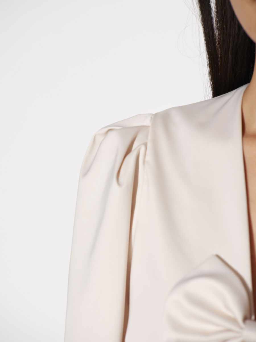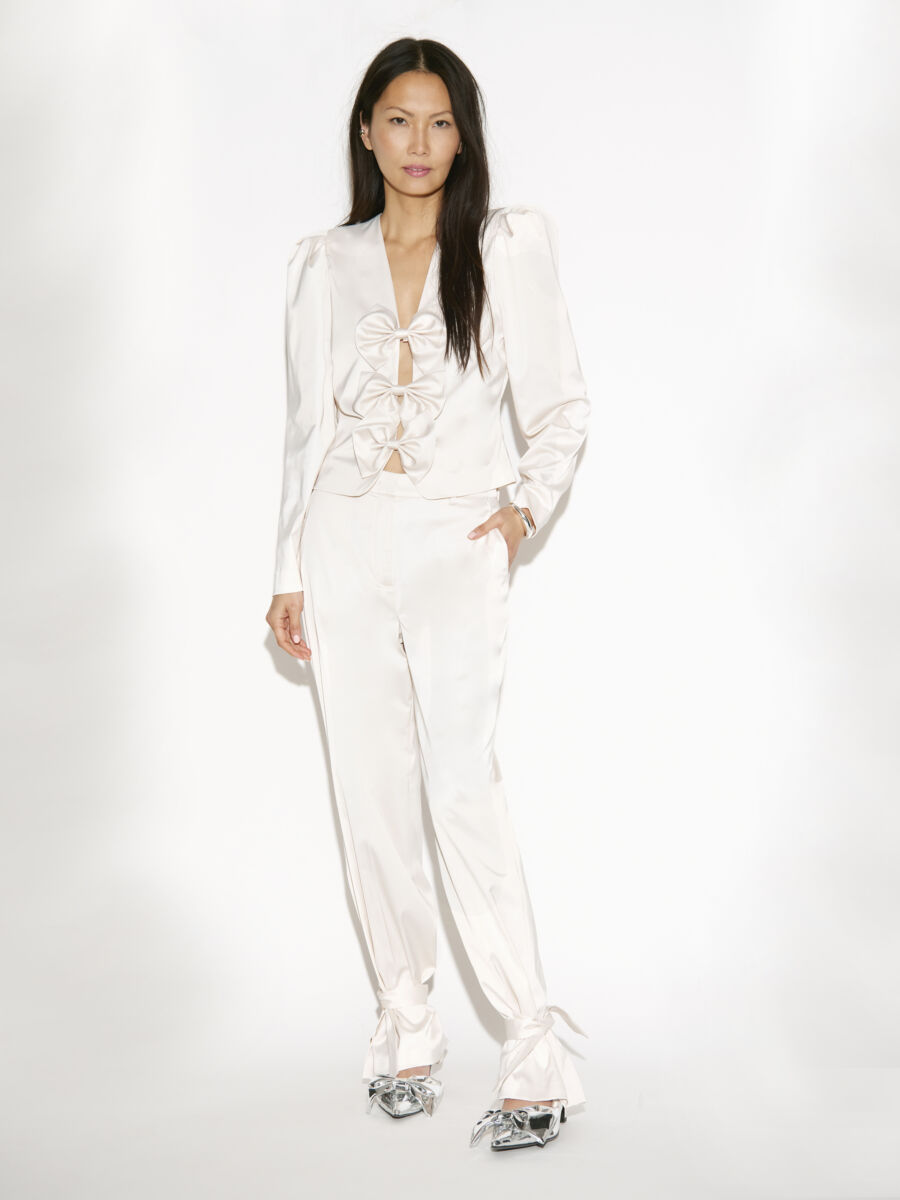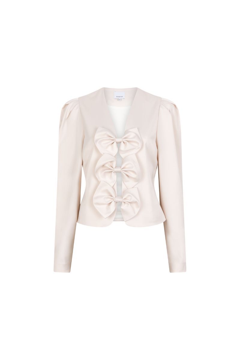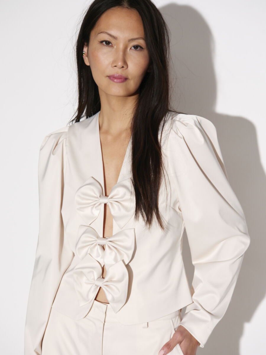 Deze top van Dante6 is echt waanzinnig! Deze top heeft super mooie lange pof mouwens en heeft aan de voorkant super leuke strikjes als details. De top heeft een V-hals en sluit met drukkers.