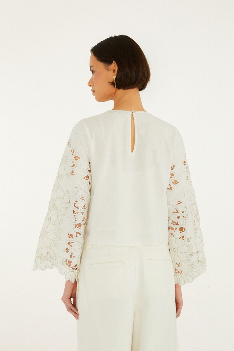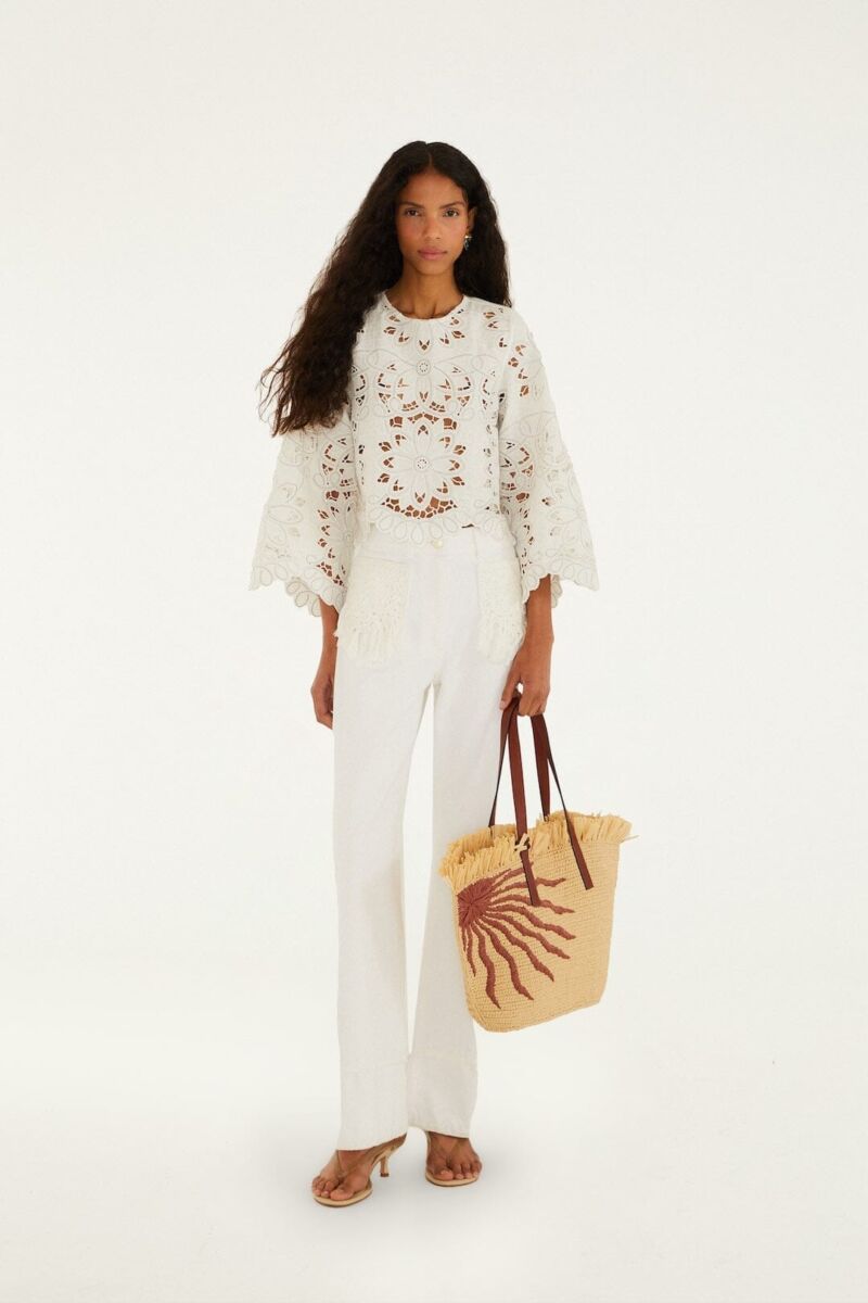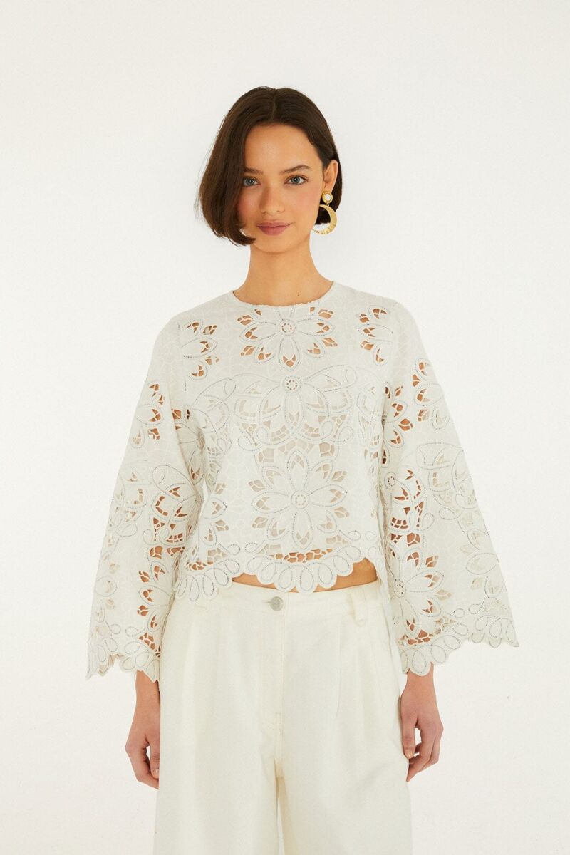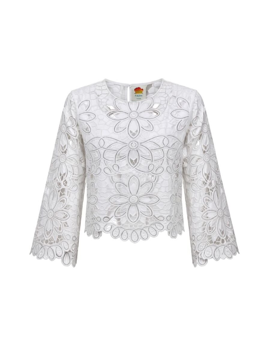 Geweldige top van Farm Rio! Het is een witte top met een ronde hals en uiteenlopende mouwen. De top heeft een opengewerkte bloemenprint en een geschulpte onderrand.