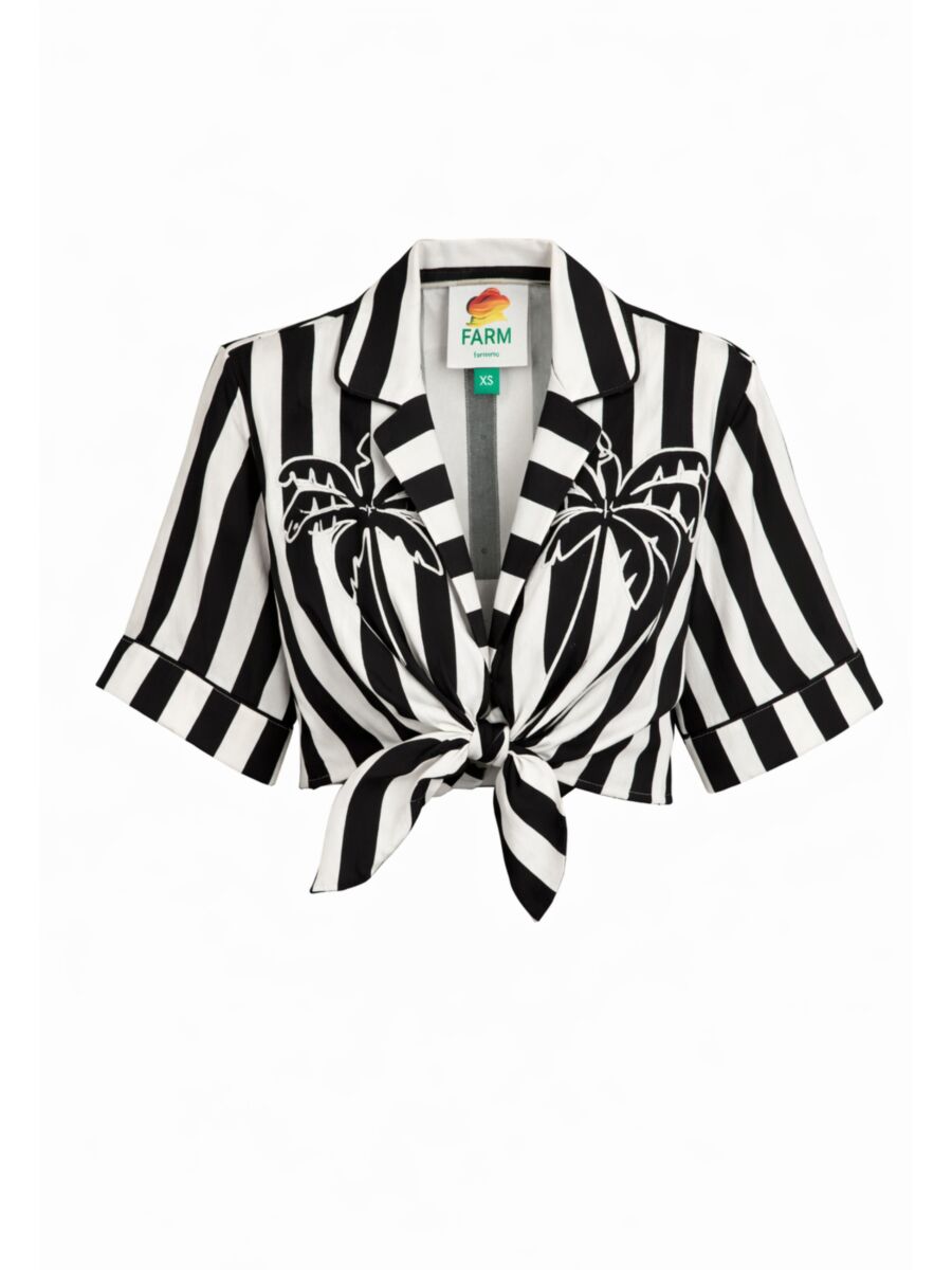 Hele leuke top van Farm Rio! Een gestreepte blouse met zwart en witte verticale strepen, voorzien van geborduurde palmboommotieven op de borst. De blouse heeft een kraag, korte mouwen, een knooploze overslag en wordt aan de voorkant gestrikt.