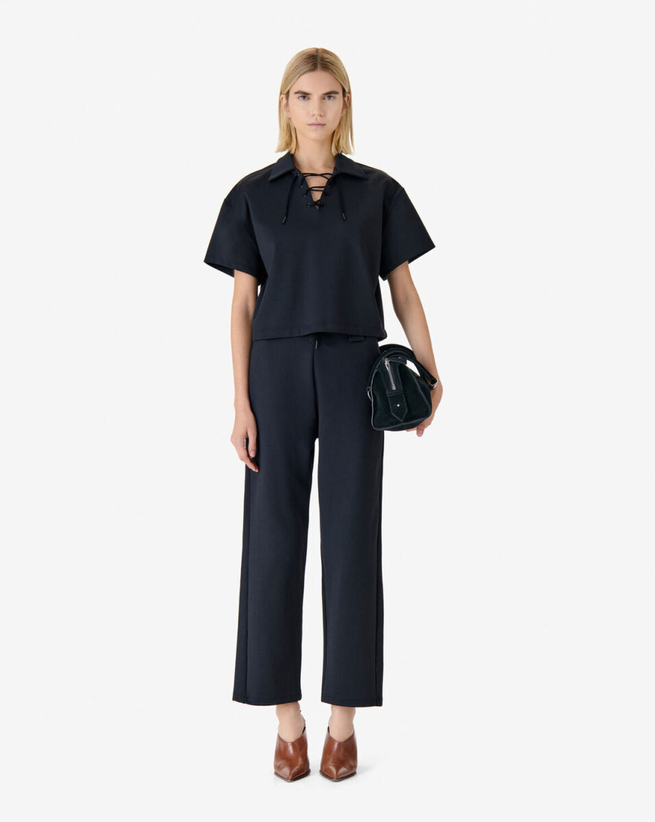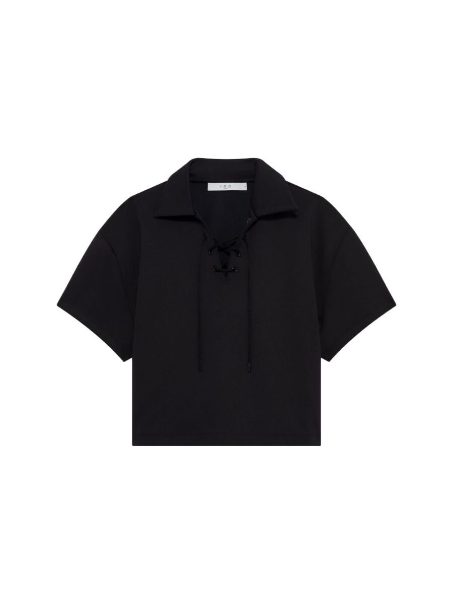 Super mooie top van Iro. Dit shirt heeft korte mouwen een V-hals. Er zit een super leuk veter detail in de V-hals. Ook heeft deze top een soort scuba stofje waar hij heel mooi in model blijft en heerlijk zacht aanvoelt.