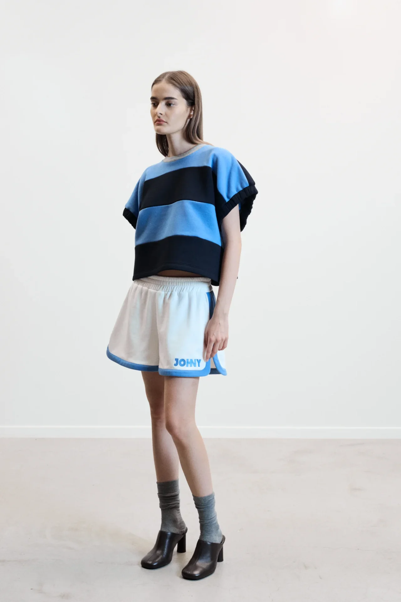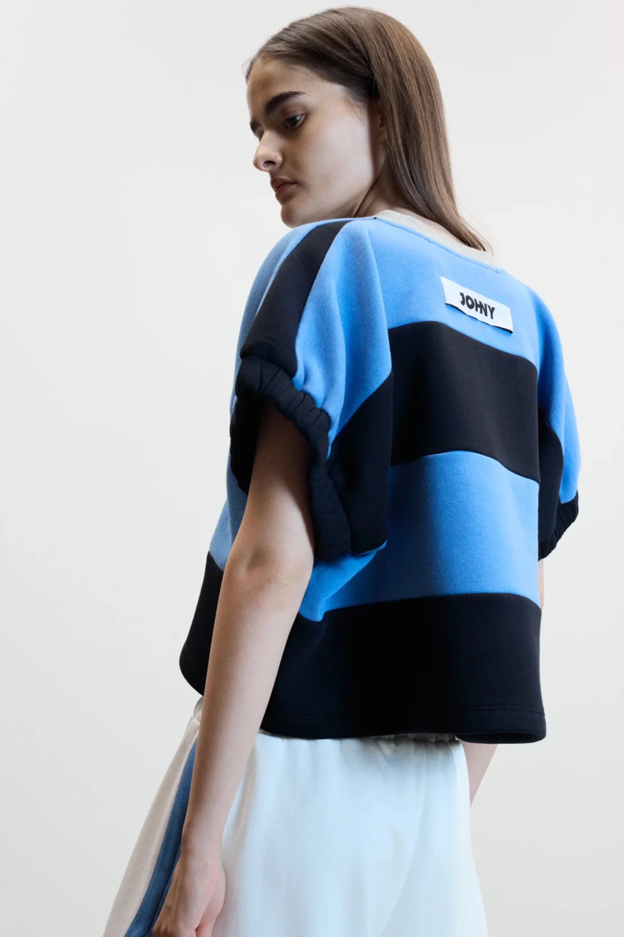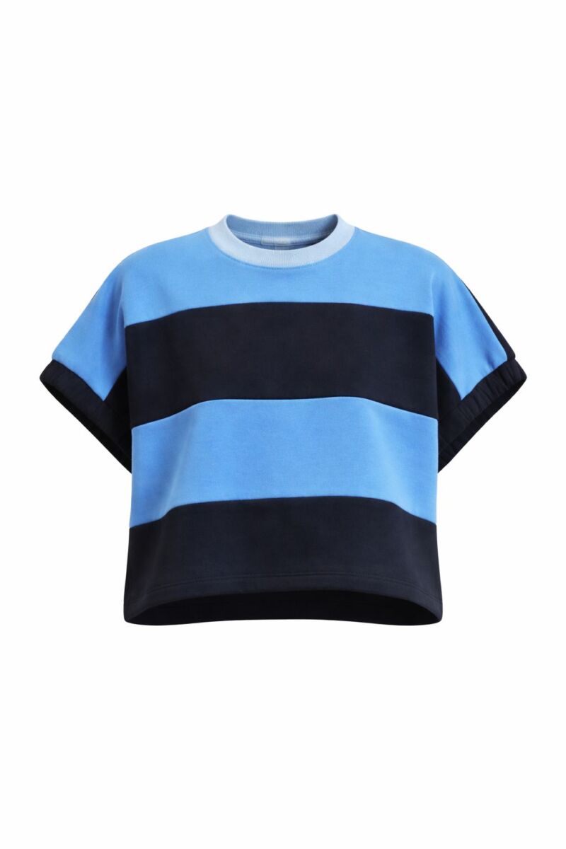 Te gekke top van Johny! Deze top heeft korte, elastische mouwen, wat zorgt voor een hele comfortabele fit. Hij heeft lichtblauwe met donkerblauwe strepen.