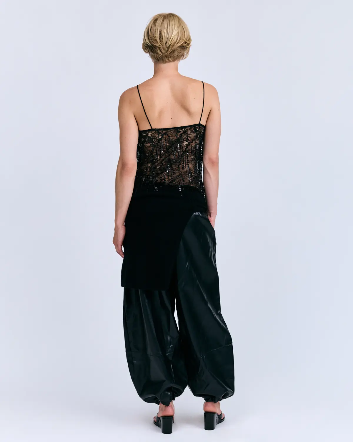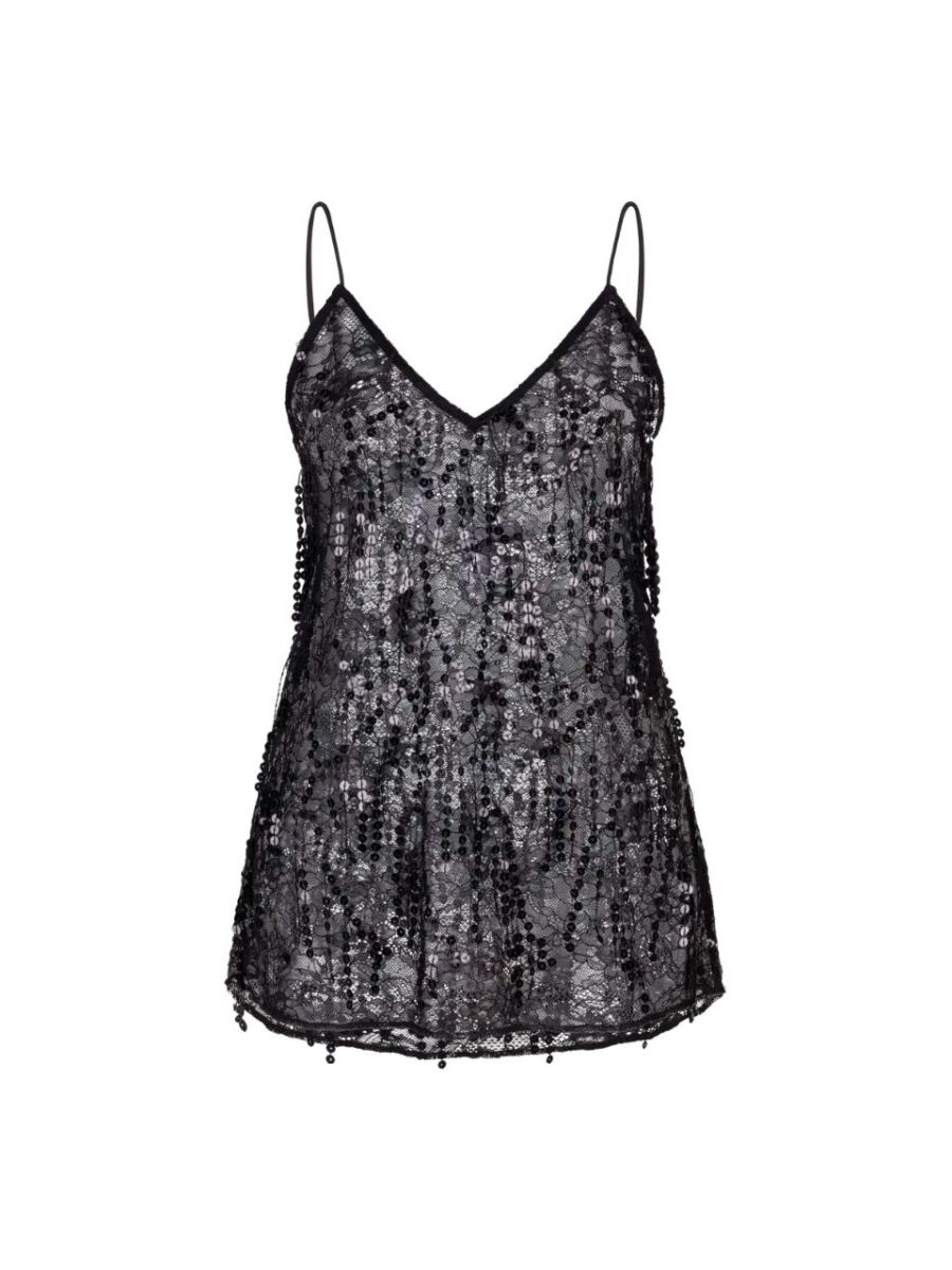Dit prachtige topje van Love Stories heeft spaghetti bandjes en een prachtige kanten stof vol glitters. Combineer met een bralette en een mooie oversized blazer.