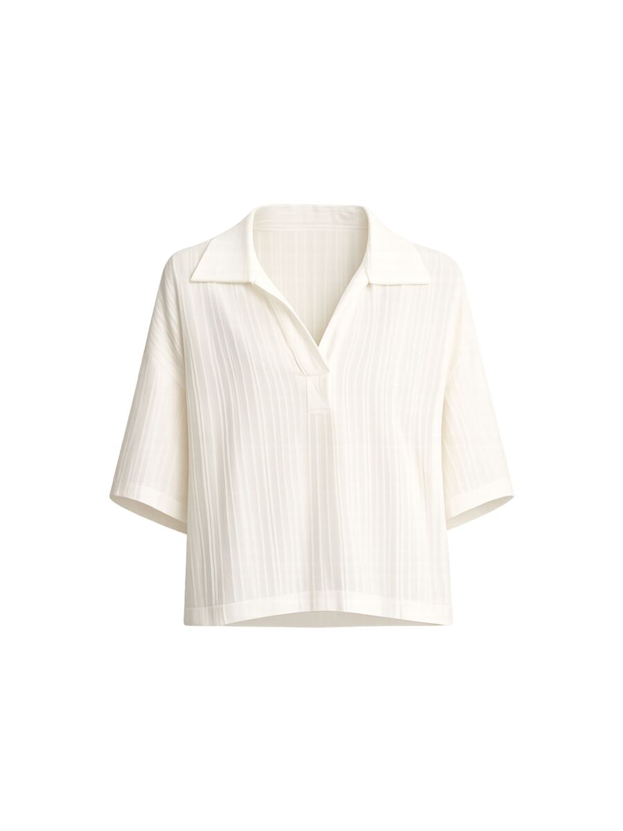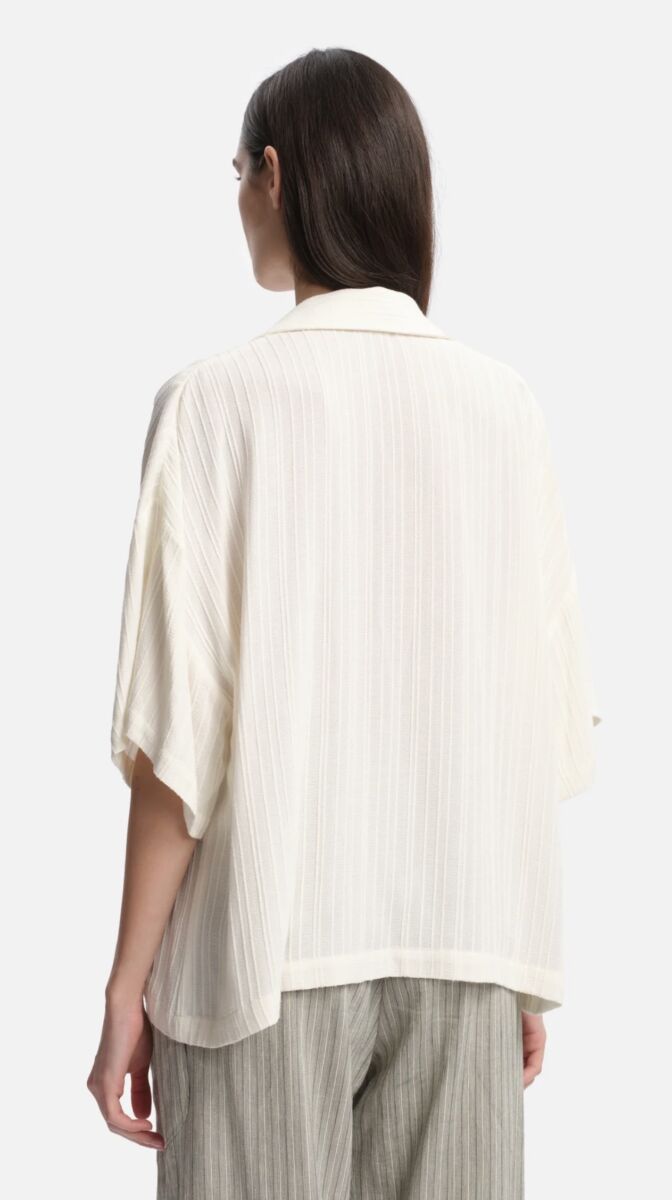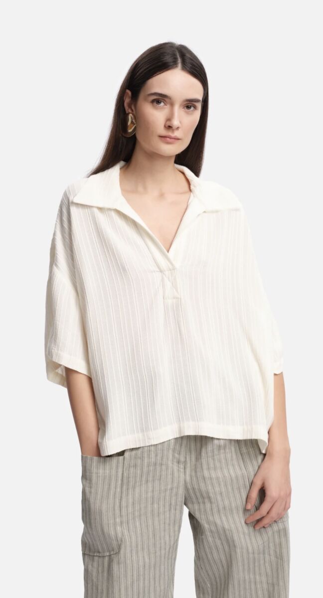 Hele leuke top van Margaux Lonnberg! Het is een losvallende top met een ruime, rechte pasvorm. De stof is licht en heeft fijne verticale ribbelstructuur. De top heeft een open polokraag met V-hals en wijde, korte mouwen die soepel vallen. De onderzijde is recht afgewerkt en valt los over de taille.