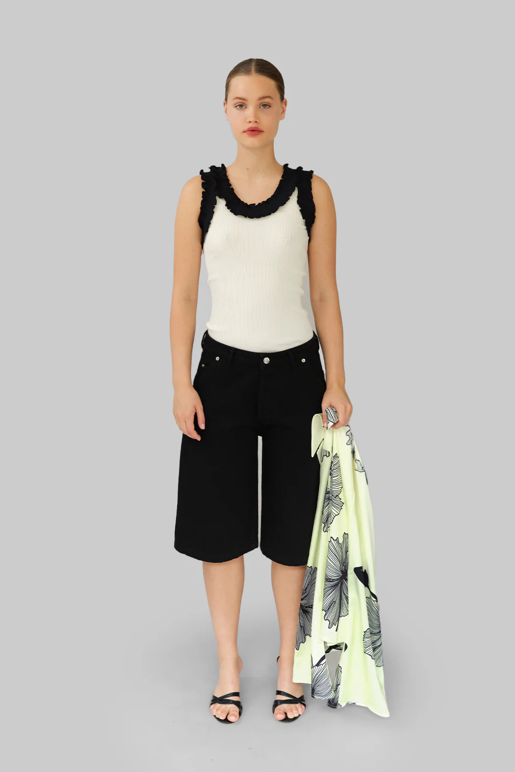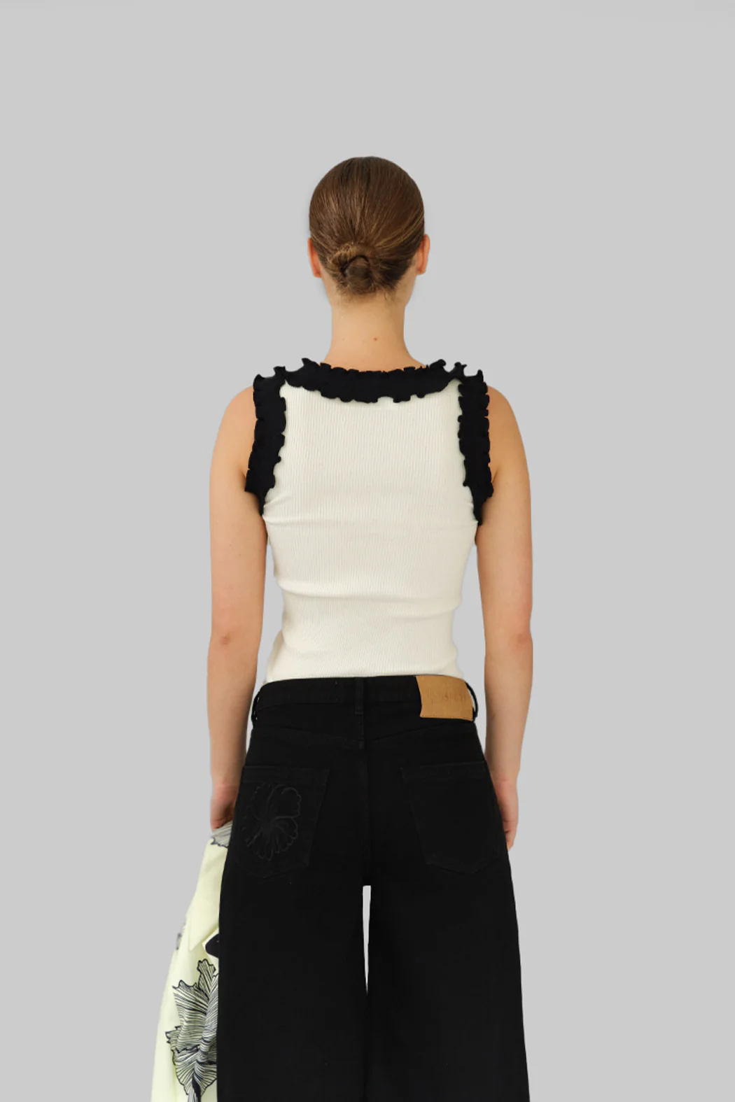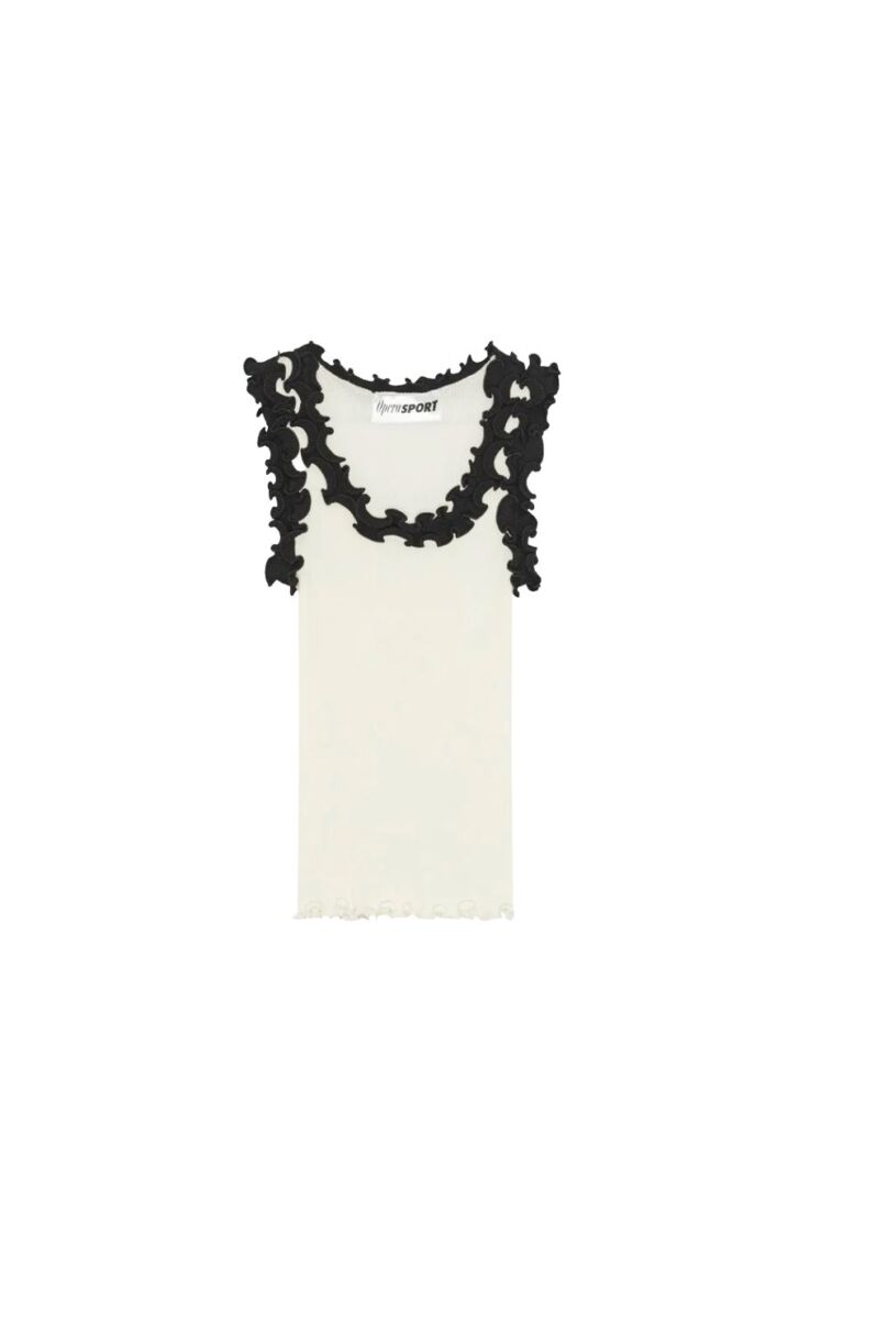 Prachtig topje van OpéraSPORT. Deze geribblde tanktop heeft een ronde hals met geweldige zwarte ruffles. Super makkelijk om overal mee te combineren!