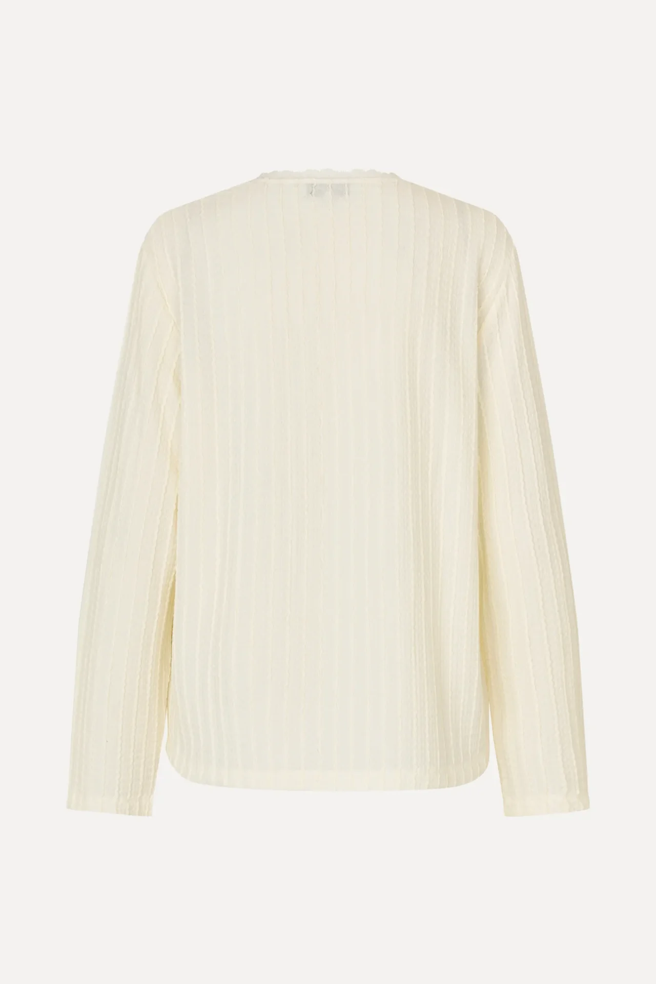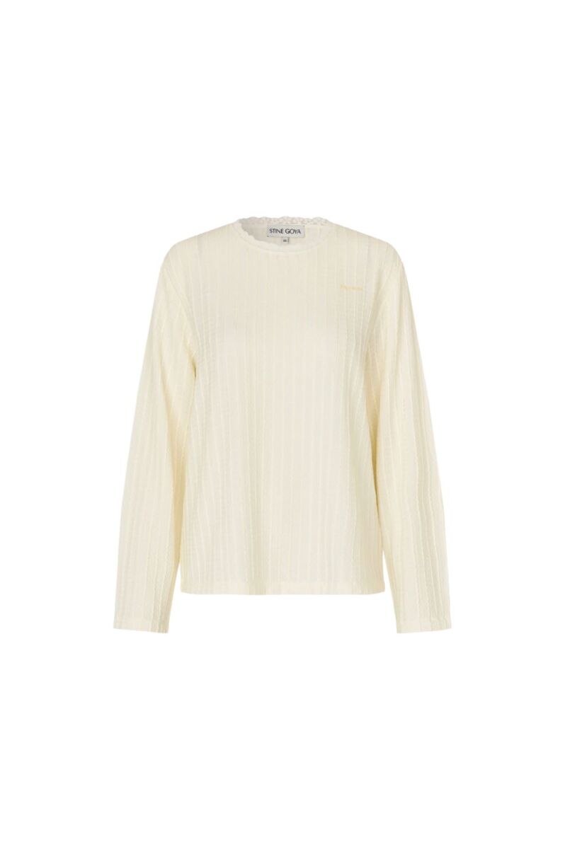 Mooie top van Stine Goya. De top heeft een crème kleur, wijde mouwen, een logo op de borst en een structuurtje in de stof. Ook heeft de top een ronde hals met een kanten kraagje. Het is een hele fijne top om overal onder te combineren.