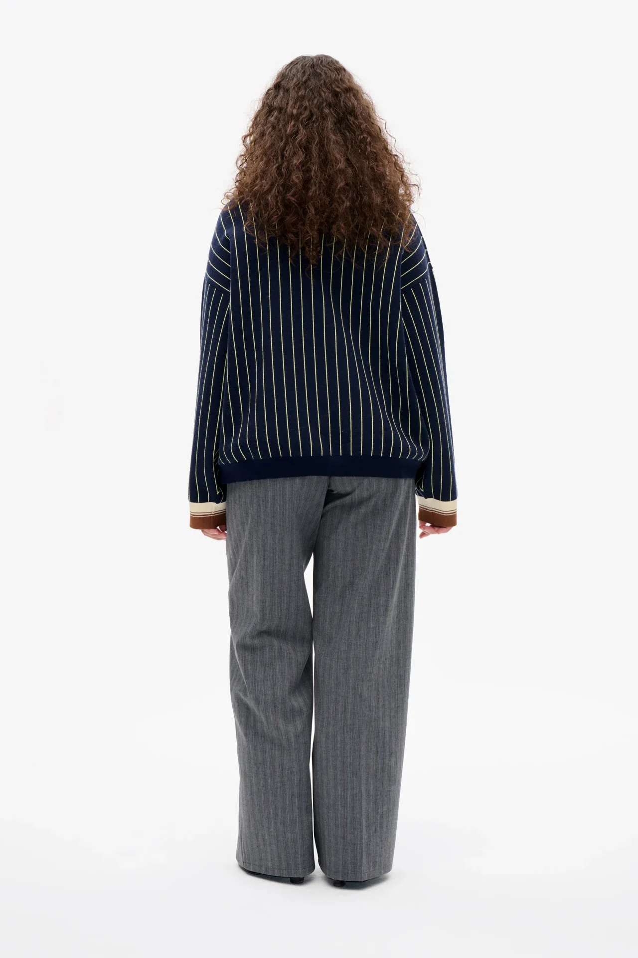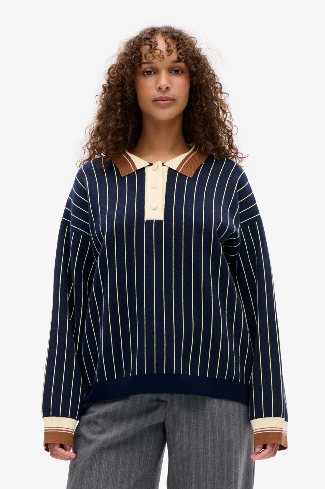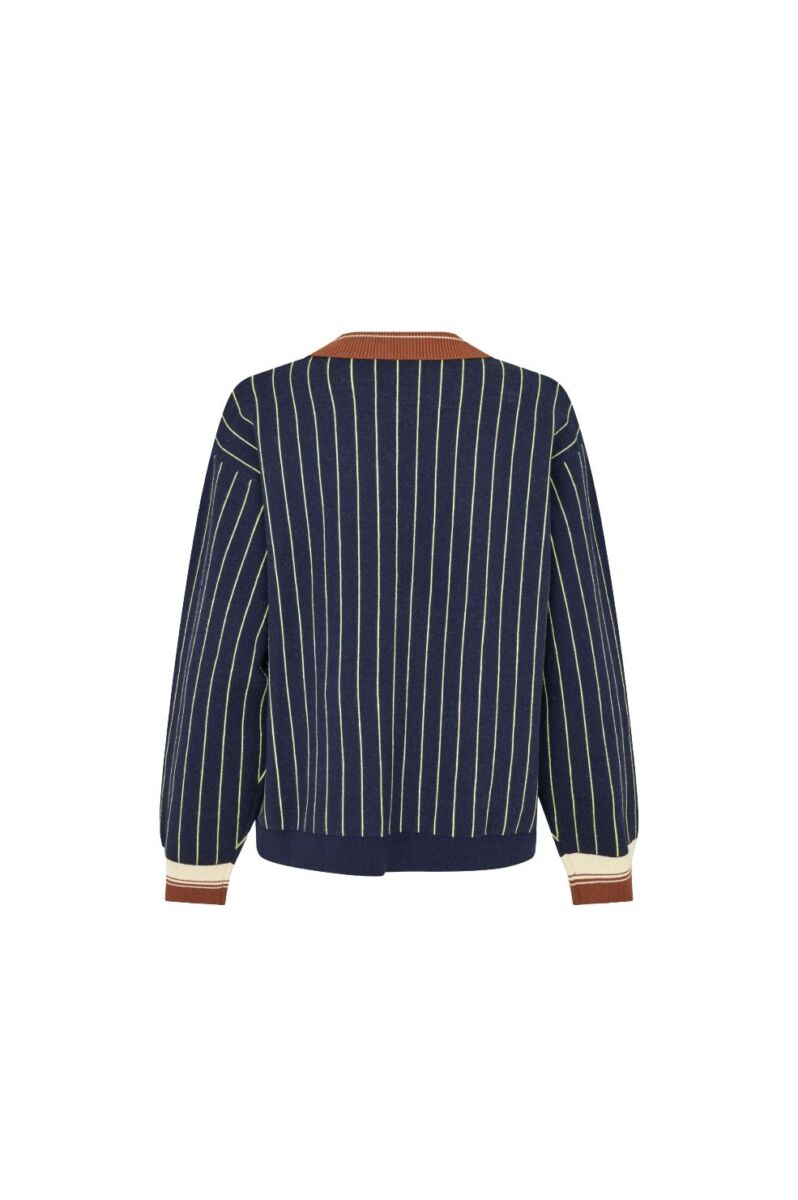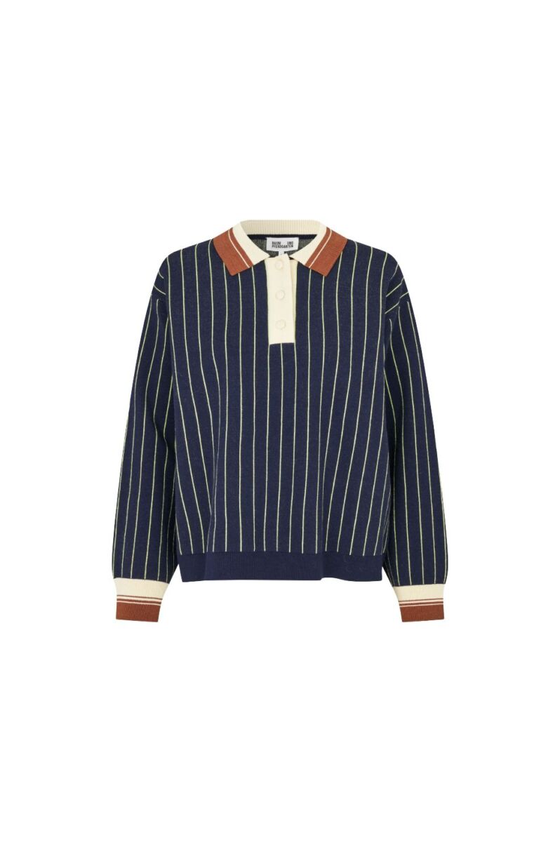 Mega leuke sweater van Baum Und Pferdgarten. De trui heeft een kraagje en knoopjes waardoor ‘die een hele leuke polo-look heeft gekregen. Hij heeft een streepjespatroon en leuke bruine details op de kraag en mouwen.