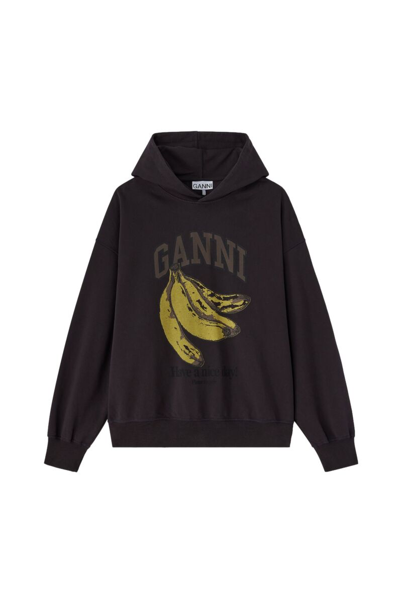 Superleuke trui van Ganni. Deze trui heeft een ronde hals en een capuchon. Ook zit het Ganni logo met bananen op de voorkant. De trui draagt echt heerlijk!