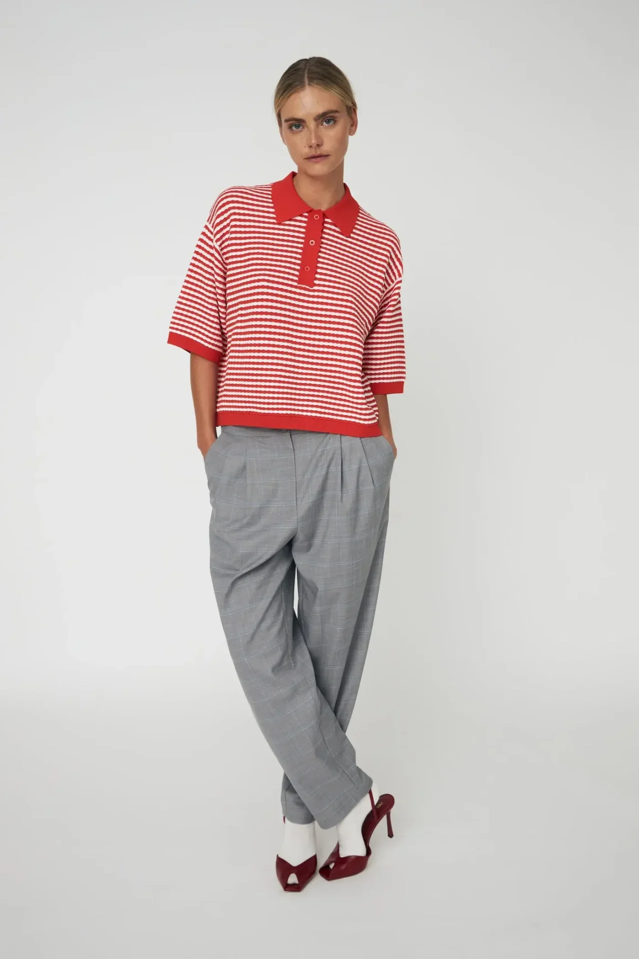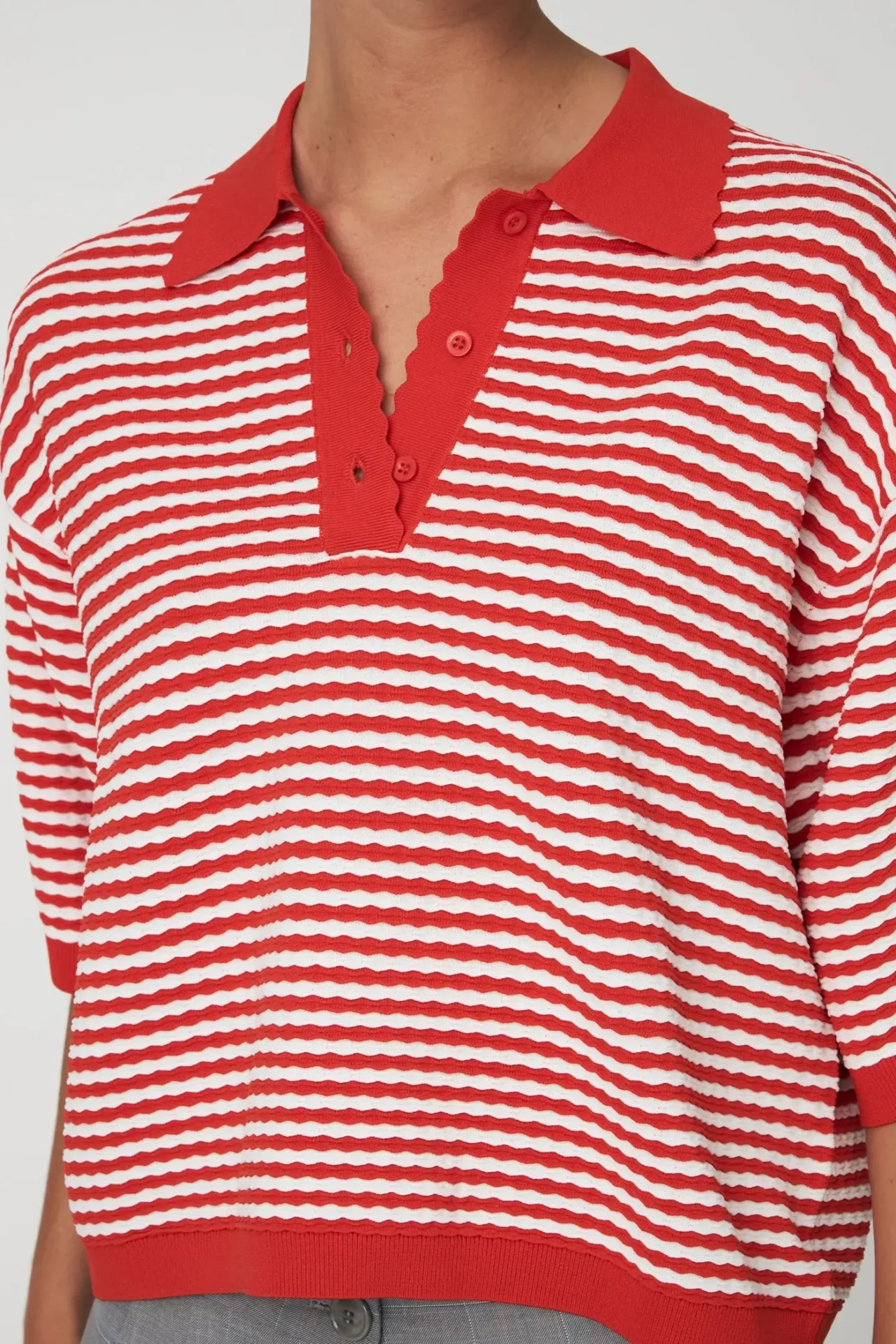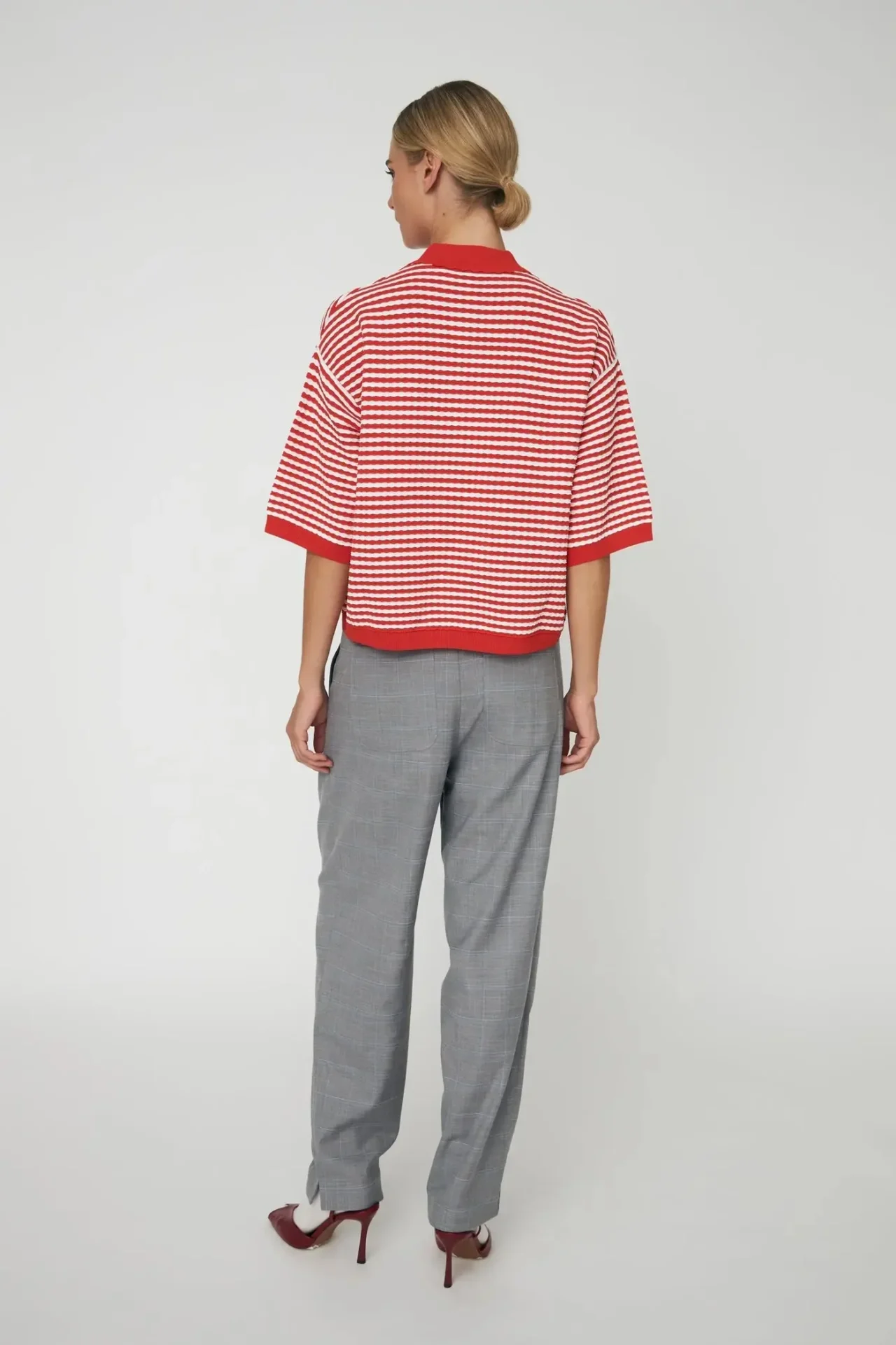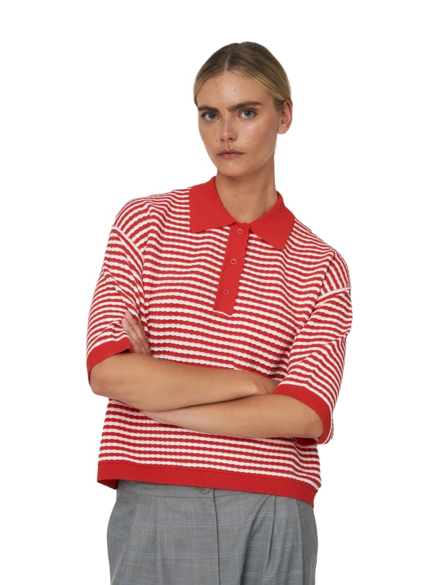 Geweldig truitje van Stella Nova! Dit truitje heeft korte mouwen en een kraag. Hij heeft superleuke rode en crème streepjes. Het kraagje heeft ribbeltjes en een knoopsluiting eronder.